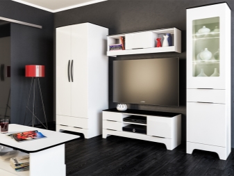 Eintürige Kleiderschränke sind zu festen Bestandteilen von Wohnzimmermöbeln geworden. Moderne stilvolle modulare Wohnräume ermöglichen es, ihre Module auf bequeme Weise beliebig zu arrangieren, um den verfügbaren Raum rationell zu füllen. Die Fassaden von Gliederschränken als Teil eines solchen Möbelsatzes können entweder taub oder transparent aus gewöhnlichem Glas-Buntglas oder sandgestrahltem hochwertigem Glas sein.