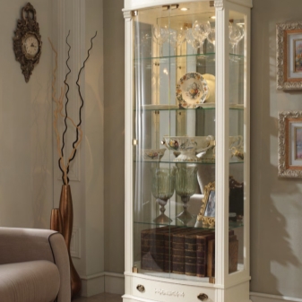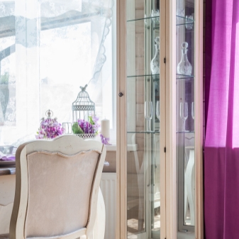 Das Modell eines Schrankgehäuses mit einem Dekor aus Glas wird sicherlich den kleinen Raum mit sich selbst schmücken, der den Horizont optisch erweitert.