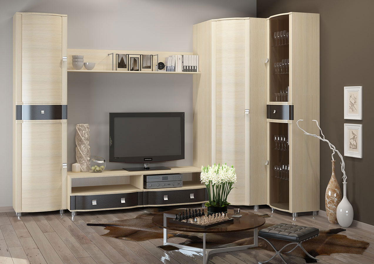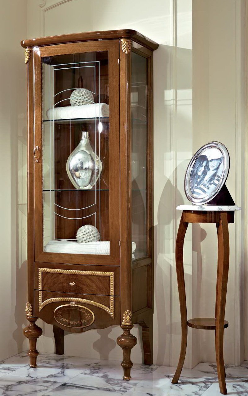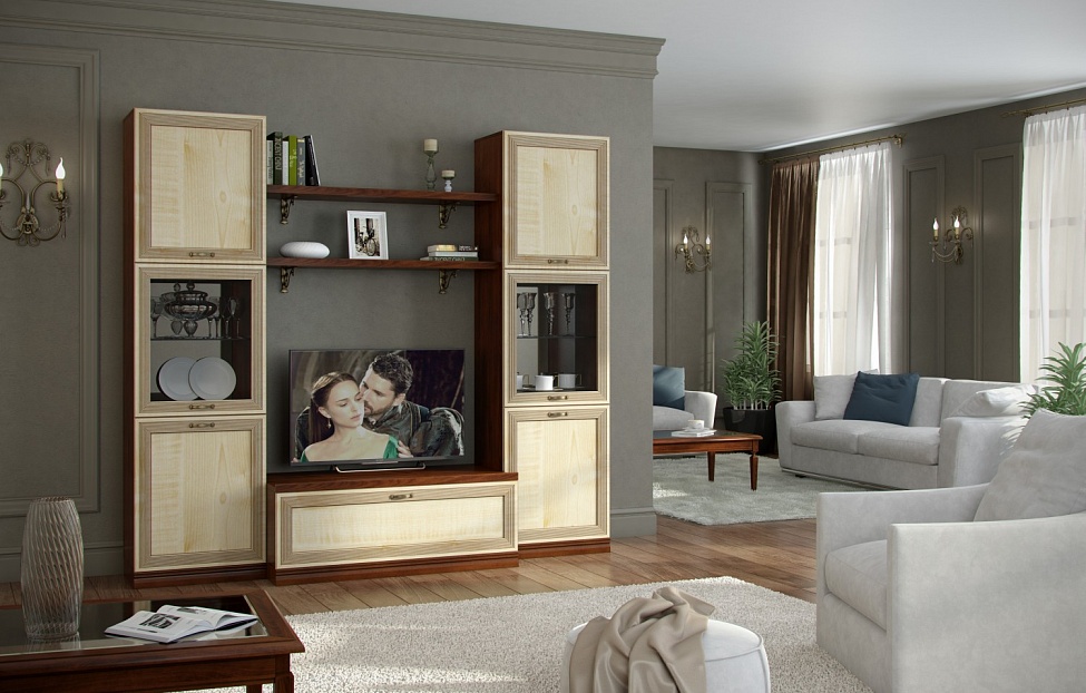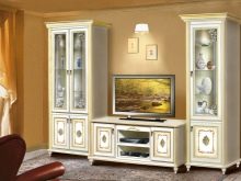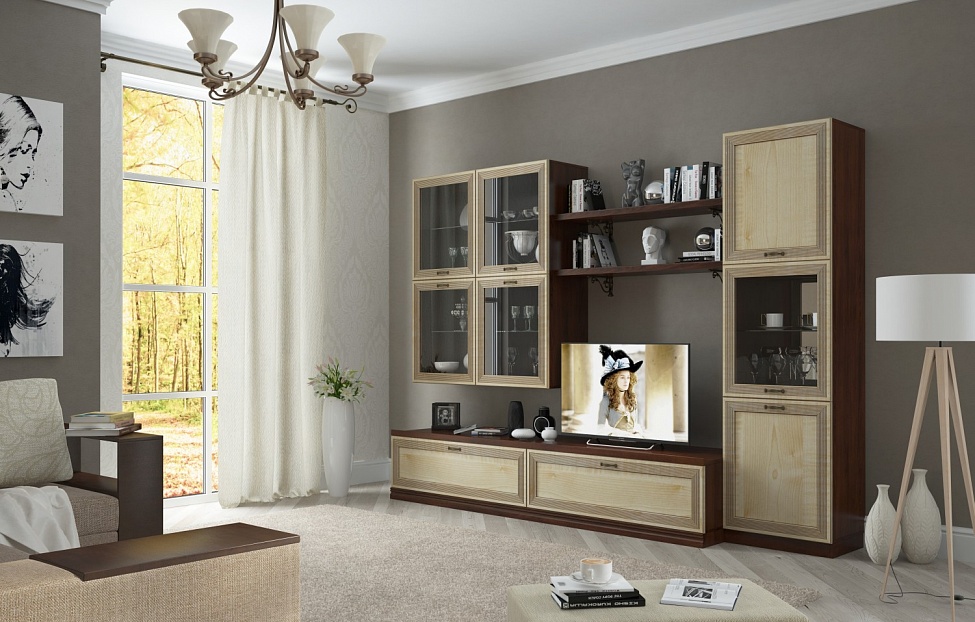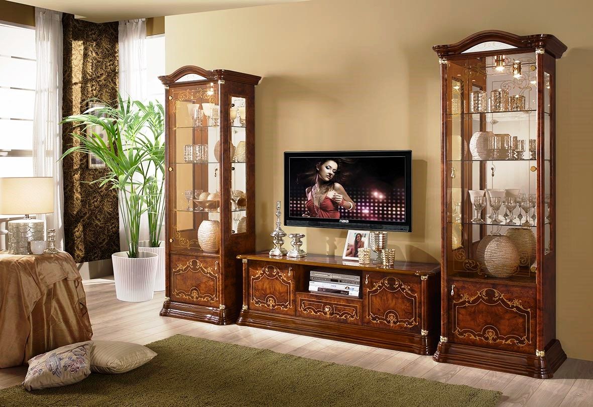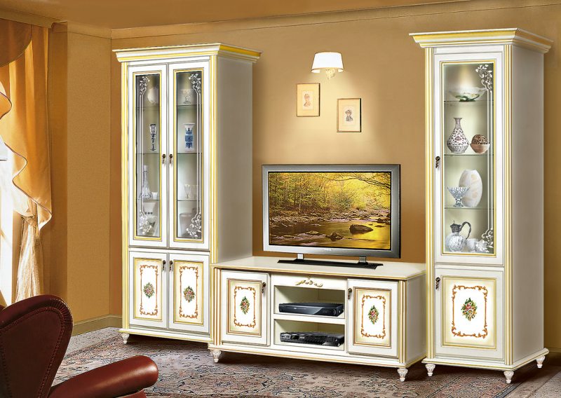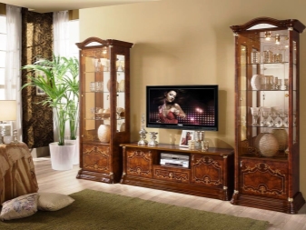 - Im klassischen Wohnzimmer entsprechendes Schrankgehäuse, dessen charakteristisches Merkmal eine Gardinenstange ist. Das Produkt mit zwei Fächern, die untere kleinere und größere Oberseite. Flügeltüren schaffen maximale Funktionalität für diese Möbel.Farblösungen können unterschiedlich sein und werden unter Berücksichtigung der vorhandenen Palette des Interieurs ausgewählt. In diesem Stil, natürliche Farben besser aussehen: Wenge, Mooreiche, Buche, Nussbaum. Die klassische Richtung wird unterstrichen durch Gussformteile von interessanter Form, die mit Bronzefarben bemalt sind.