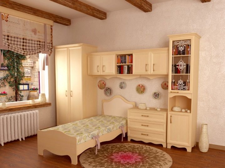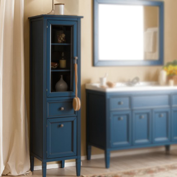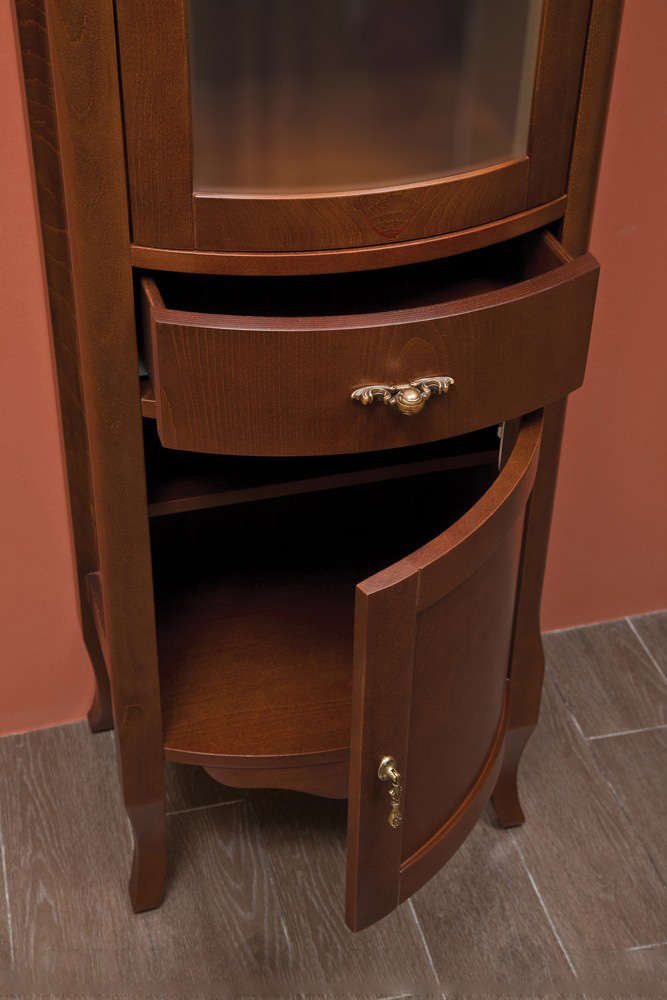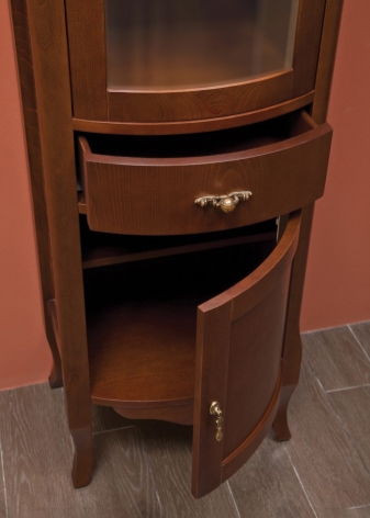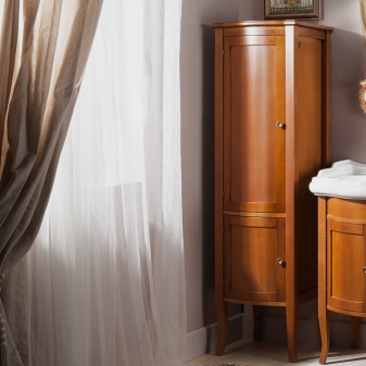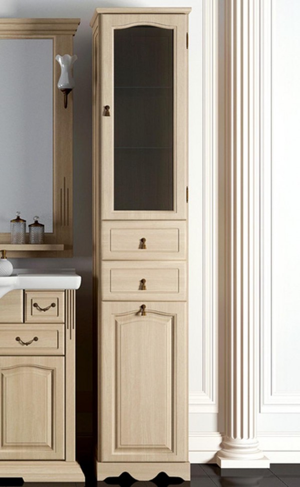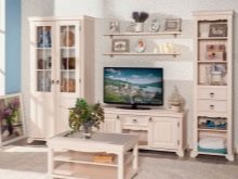 - Provence-Stil - Dies ist eine Säule in hellen Farben, wie alle Möbel aus Massivholz. Das hohe Gesims ist mit Schnitzereien verziert, die Basis ist ebenfalls verziert. Modell mit niedrigen geschwungenen Beinen, an den Drehtüren - Griffe, die sich durch Eleganz auszeichnen. All dies zusammen unterstreicht die Leichtigkeit und Harmonie dieses südlichen Stils.