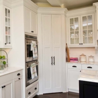 - In das Innere der Küche lassen sich leicht verschiedene Haushaltsgeräte einbetten. Dank der hohen Höhe ist es möglich, sogar einen Kühlschrank einzubauen. Eine andere Möglichkeit ist es, gleichzeitig viele Elektrogeräte einzubetten: einen Mikrowellenherd, einen Brotbackautomaten und eine Kaffeemaschine.