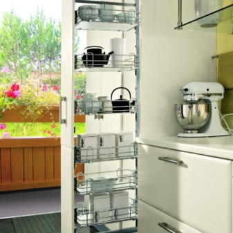- Es ist notwendig, im Voraus über die Ausrüstung, das Vorhandensein von verschiedenen Regalen und Fächern in einem schmalen Schrank zu denken.