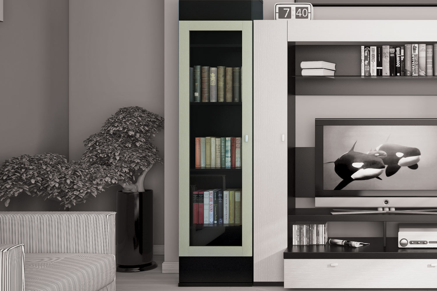- Im Wohnzimmer, dekoriert im Minimalismus StilEs gibt ein großes dunkles Federmäppchen mit transparenten Glastüren. Das dezente Design der prägnanten rechteckigen Form betont die Strenge. Das Gehäuse als Vitrine ist ausdrucksstark durch die Innenbeleuchtung.
