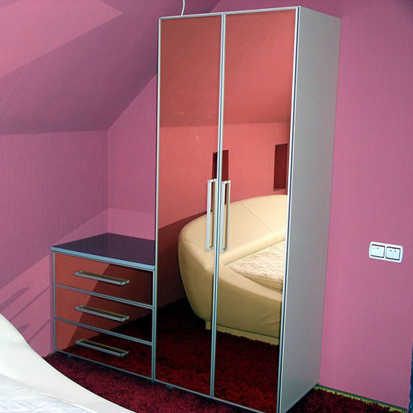 Ein schmaler Kleiderschrank mit Glas ist im Schlafzimmer gekauft. Oft sind diese Modelle einflügelig, aber es gibt auch einen Doppelkleiderschrank mit Kleiderstange. Für das Schlafzimmer ist eine zweitürige Version mit einer Kommode sehr geeignet. Praktisch alle Modelle von Schrankkästen sind mit zahlreichen Schubladen, diversen Regalen und speziellen Wäschekörben ausgestattet.