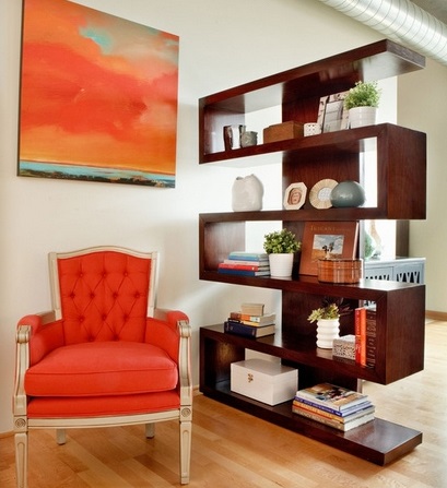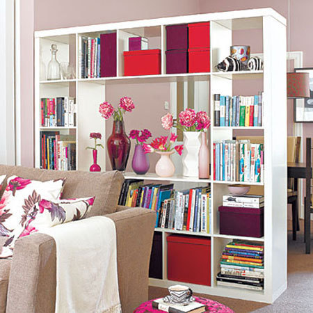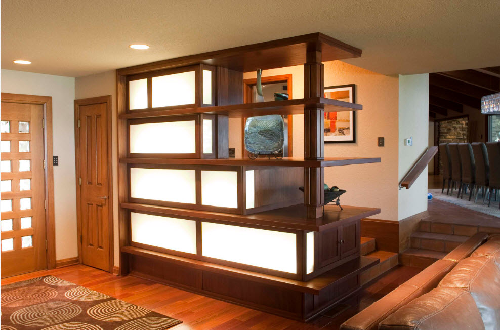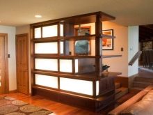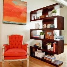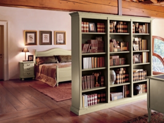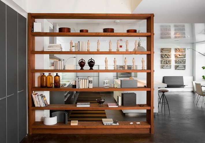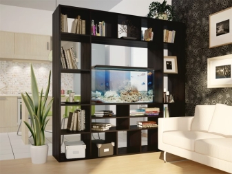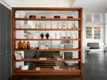 Diese Methode ist praktisch, wenn Sie keine vollständige Isolierung jeder Zone benötigen.Regale des Regals können für Bücher verwendet werden, sowie für verschiedene Kleinigkeiten, die dem Raum Gemütlichkeit und Individualität verleihen: interessante Vasen, Aquarien, Fotos, Blumen in Schalen. Die Trennwand schließt die andere Raumhälfte nicht wie gewöhnliche Möbel.