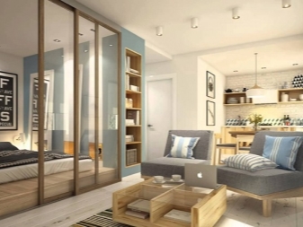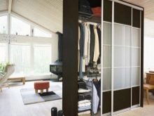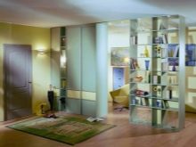 - Kleiderschrank-Trennwand. Das moderne Design der Innentrennwand, die Schiebeabteiltüren hat. Es ist das kompakteste und sieht sehr beeindruckend aus. Spiegelbilder werden oft verwendet, um die Fassaden von Türen zu beenden, was jeden Raum leichter macht. Selbst in dem Teil des Raumes, in dem die Fensteröffnung blockiert ist, wird es nicht so dunkel wie im Falle einer Ziegelmauer.
