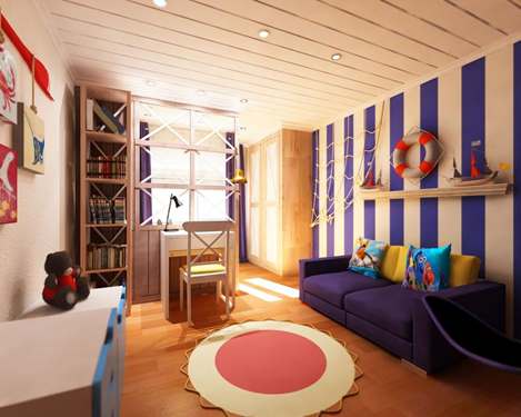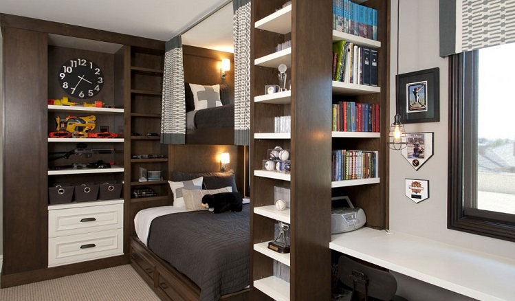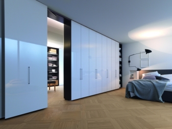 Als Option ist es möglich, auf einer Seite des Schranks eine Bibliothek mit offenen und geschlossenen Bücherregalen zu haben. Wenn ein Schlafzimmer durch die Wand hindurchgeht, kann ein Teil der Trennwand, die dorthin zeigt, mit ausziehbaren Schubladen, Abschnitten für Bettzeug und Körben für Kleidung ausgestattet sein. Wenn Sie dort ein Kinderzimmer einrichten möchten, können Sie Kinderbücher und Plüschtiere in den zahlreichen Regalen aufstellen.