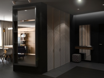 Eine doppelseitige Trennwand, deren Fassaden sich auf beiden Seiten befinden, wird effizienter in einem großen Raum platziert. Solche Produkte unterscheiden sich in der Regel in großer Tiefe, und dies gewichtet die gesamte Struktur optisch. Die Verwendung von Spiegelfassaden kann den Raum jedoch optisch vergrößern.