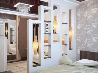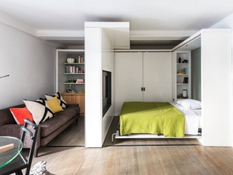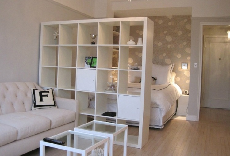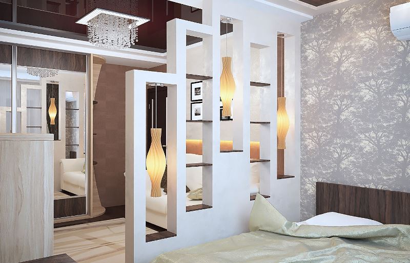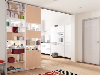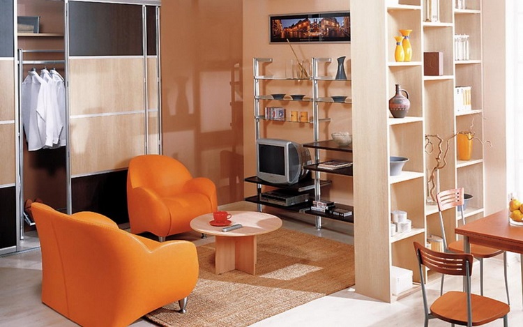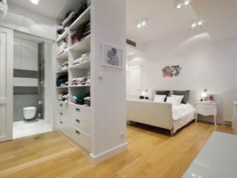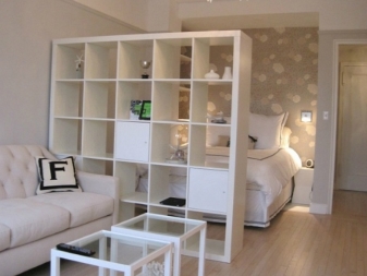 - Eingebaute Schrankwand. Eine solche Variante der Trennwand kann installiert werden, ohne auf die Hauptwände angewiesen zu sein. Die Konstruktion wird in der Mitte des Studios errichtet.