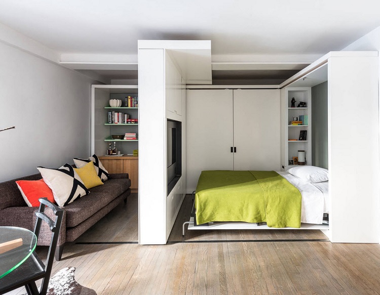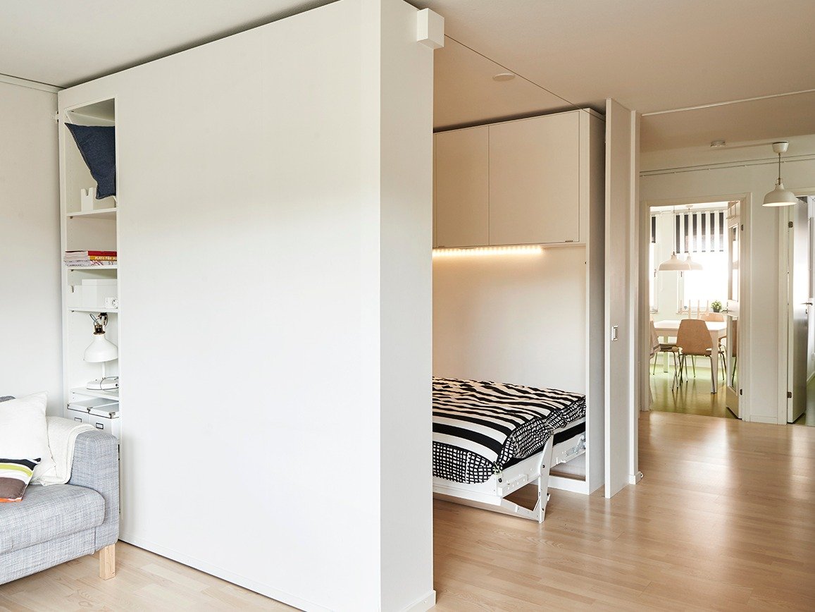 Doppelseitige Trennwand kann den Raum in ein Schlafzimmer und ein Wohnzimmer verwandeln und diese Zonen abgrenzen.In einer solchen Trennwand sind Regale, Schubladen sowie ein Klappbett oder Tisch angeordnet. Diese Lösung bietet die Möglichkeit, den Raum leicht zu transformieren.