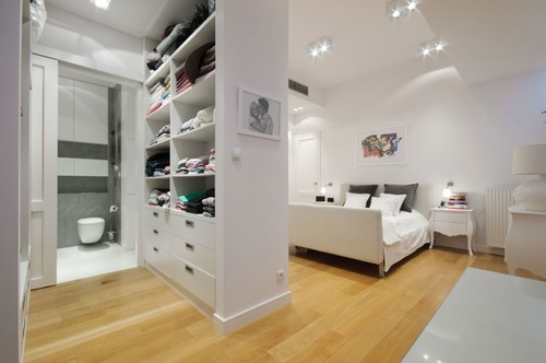 Besitzer von Studio-Apartments müssen das Problem der Einteilung in Zonen lösen. Es ist jedoch unmöglich, sperrige Wände oder Trennwände aus Ziegeln und anderen Materialien zu installieren. Ein zugänglicher Weg aus dieser Situation könnte die Verwendung als funktionale Trennwand eines Kleiderschranks, eines einfachen Kleiderschranks oder eines Racks sein. Platzieren Sie solche Möbel im Studio an der Stelle, die Sie benötigen, können Sie den Raum ohne die zusätzlichen Kosten und Ärger, die mit größeren Reparaturen verbunden sind, leicht teilen.