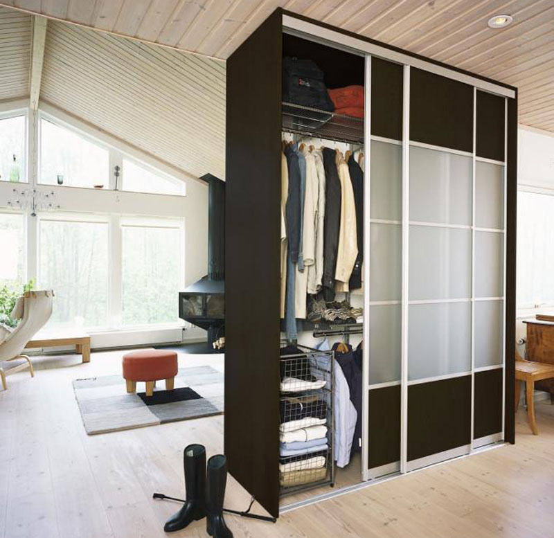 In der Ein-Zimmer-Wohnung sieht der Kleiderschrank perfekt aus.Diese improvisierte Trennwand kann den Raum in Zonen unterteilen. In der Mitte des Schrankes muss ein Türfach mit Zwischenräumen angebracht sein. In diesem Fall ist eines der Teile ohne Fenster, es eignet sich für die Dekoration des Schlafzimmers. Der Teil mit dem Fenster ist wie ein Wohnzimmer oder Büro ausgestattet.