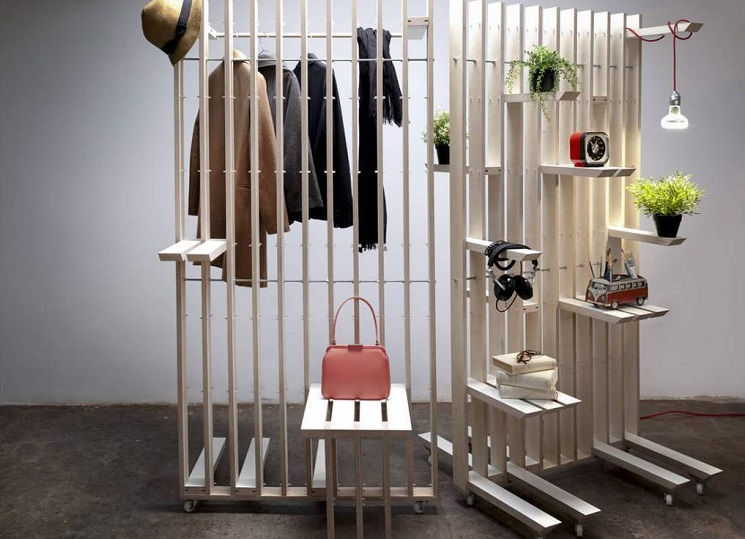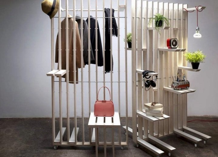 In diesem Fall werden Möbel mit einem doppelten Vorteil erhalten - die Trennwand wird mit der Garderobe kombiniert.