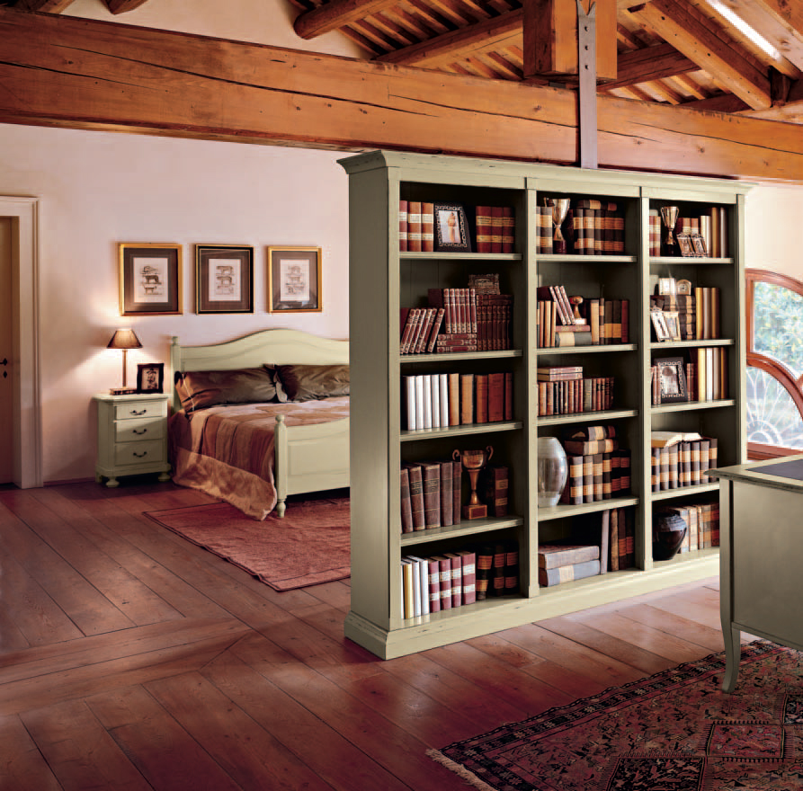 - Regal-Partition. Durch Design mit fehlender Rückwand. Eine Besonderheit einer offenen Trennwand ist die Bequemlichkeit des Zugangs zu den Dingen, die sich in den Regalen befinden, da die Möbel auf der anderen Seite nicht umgangen werden müssen. Ein solches Rack trennt nur die verschiedenen Teile des Raumes, nicht vollständig überlappend. Diese Zonierungsoption macht den Raum hell und transparent.