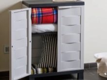 - Für Badezimmer und Toilette Kunststoff ist eines der am besten geeigneten Materialien. Unabhängig von der Luftfeuchtigkeit und den Temperaturunterschieden ist ein solcher Schrank ein hervorragender Aufbewahrungsort für Hygieneartikel und Haushaltsgegenstände. Es befindet sich oft über dem Waschbecken und wird manchmal mit offenen Regalen ergänzt.