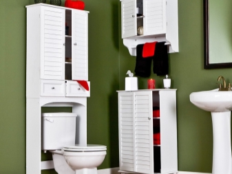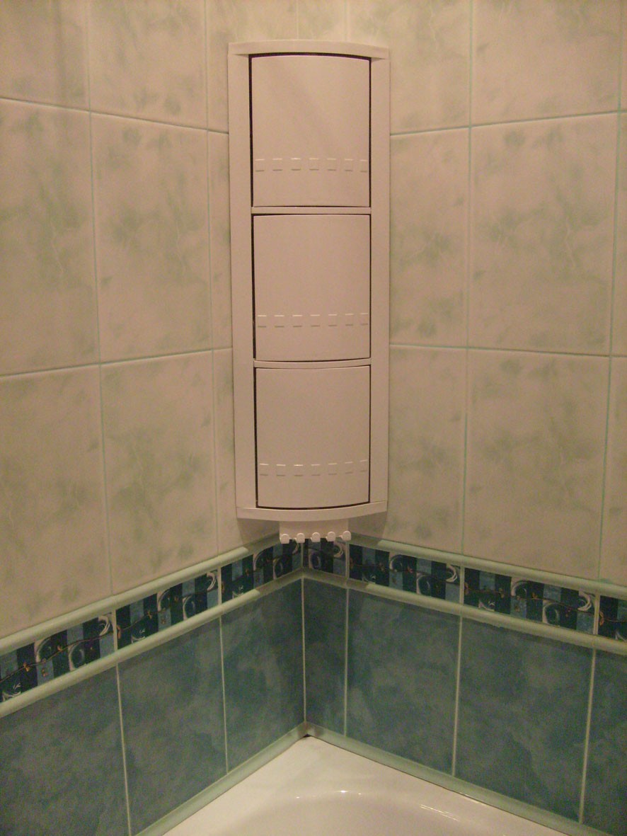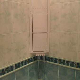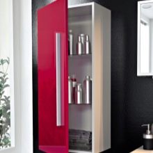 - Eckschrank. Je nach Funktion kann es sich um ein massives Möbelstück handeln, das als Ankleidezimmer installiert wird. Seine Variante ist ein kleiner Hochschrank, der die Größe des Raumes nicht reduziert. Das Badezimmer wird oft mit einem kleinen Hängeschrank für kleine Plastikgegenstände geliefert, die den Raum nicht durcheinander bringen.