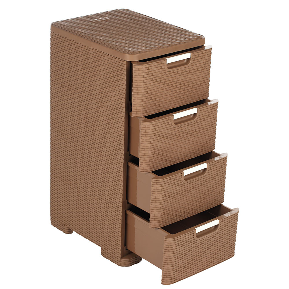 - Für diejenigen, die Dinge in Fächer verteilen möchten, wird eine Alternative zum Schrank sein Kommode aus Kunststoff. Dieses Design mit Schiebeteilen ist sehr beweglich, Sie können Schubladen leicht entfernen, eine Kommode bei Bedarf bewegen und ihre Kompaktheit genießen.Kreative Lösung im Innenraum wird ein elegantes Modell aus Rattan sein.