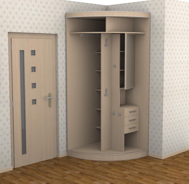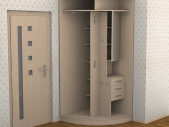- Zum Beispiel können Sie einen Eckradiusschrank in den Flur stellen. Wählen Sie gleichzeitig das interessanteste Design. Dekorieren Sie das Produkt und die Fülle der Regale. Sie legen alle notwendigen Dinge auf sie.