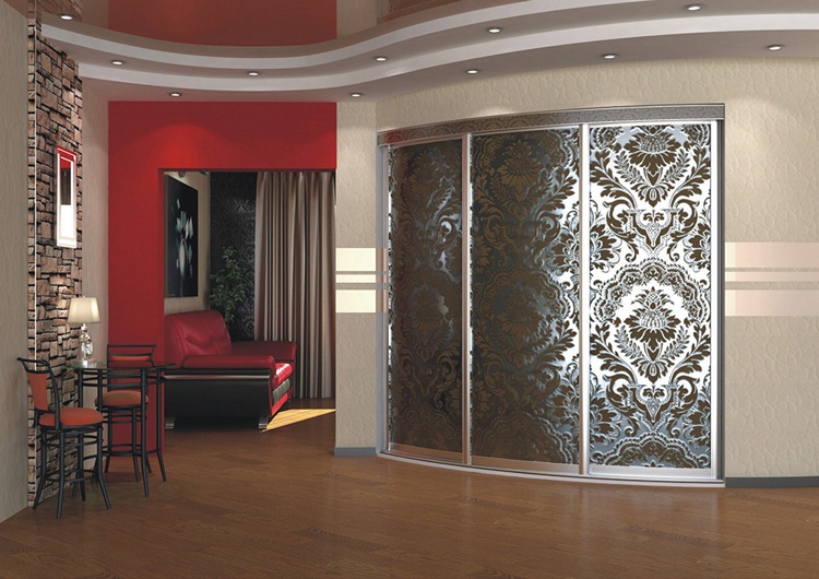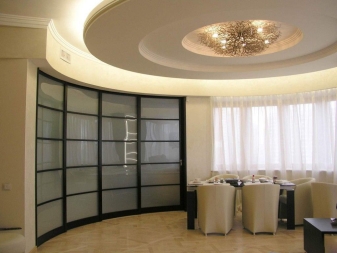 Am häufigsten verwendet und MDF. In diesem Fall kann das Profil sehr unterschiedlich sein. Sie können Emaille, PVC-Folie usw. verwenden. Diese Option ist häufiger, da Sie die interessantesten und kreativsten Modelle zu einem vernünftigen Preis kaufen können. Radius Trennwände können aus Gipskartonplatten hergestellt werden.
