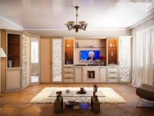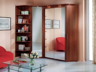 - Für Wohnzimmer. Eckmöbel in Gemeinschaftsräumen sind keine Seltenheit, besonders wenn es sich um ein Studio handelt. Neben diesem Schrank sind oft Bücherregale und Schränke für die Ausrüstung.