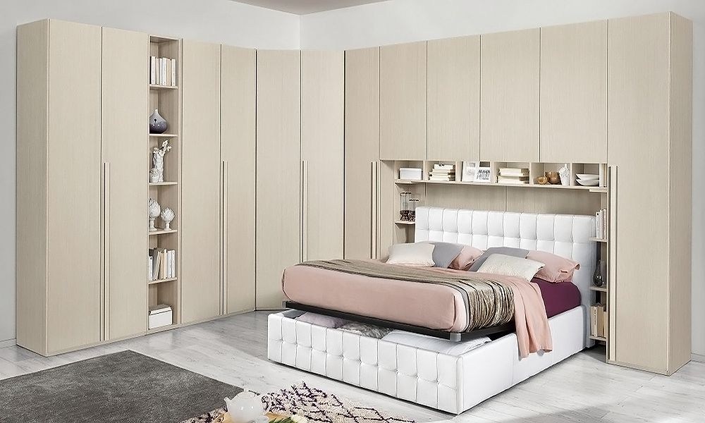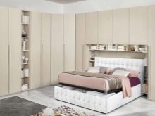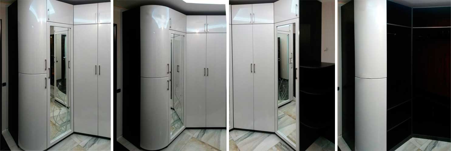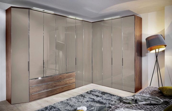 - L-förmig. Dies sind zwei separate oder miteinander verbundene Schränke in einem Winkel von 90 Grad zueinander. Solche Entwürfe können auch eine unbegrenzte Anzahl von Türen haben und den gesamten Wandabstand von einer Ecke zur anderen einnehmen.