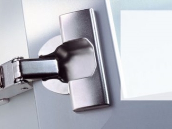 - Scharniere mit vier Scharnieren ermöglichen die Befestigung der Schranktür in verschiedenen Ebenen und Winkeln.Die einzige Schwierigkeit, die bei der Wahl dieses Mechanismus auftreten kann, ist die Komplexität der Selbstinstallation zu Hause ohne spezielle Ausrüstung zum Bohren von Löchern in das Glas.
