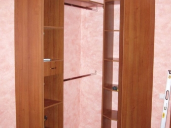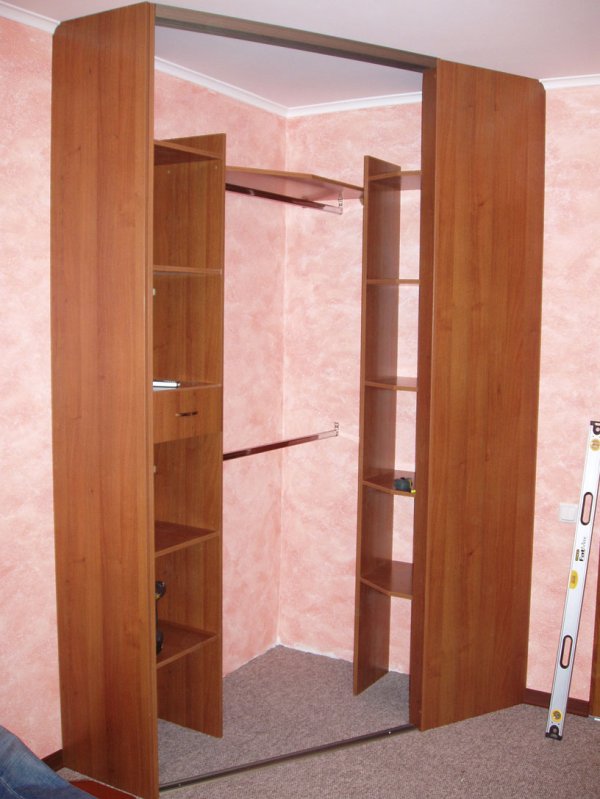- Eingebettet - In diesem Fall hat das Gehäuse keine eigenen Seitenwände, alle Innenseiten sind an der Wand des Raumes angebracht, in dem es sich befindet. Meistens sind es Kleiderschränke, die sich im Schlafzimmer oder im Flur befinden. Dieses Design ist gut, weil es Platz spart, aber sein Nachteil ist, dass es unmöglich ist, es neu anzuordnen, und wenn es sich bewegt, wird es äußerst schwierig sein, es zu zerlegen und mitzunehmen.