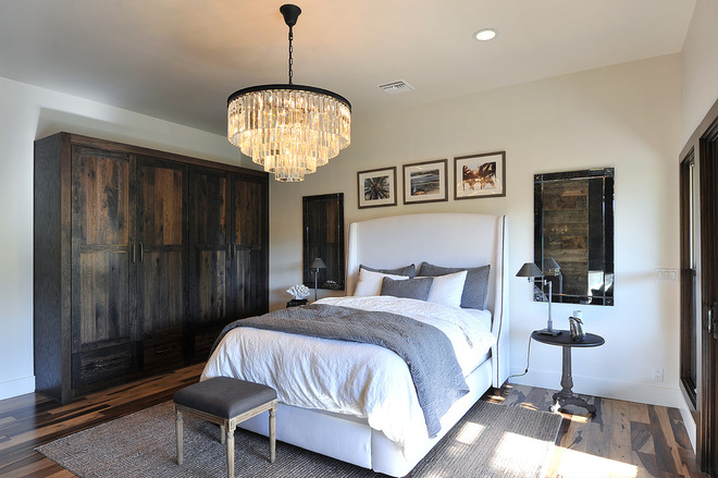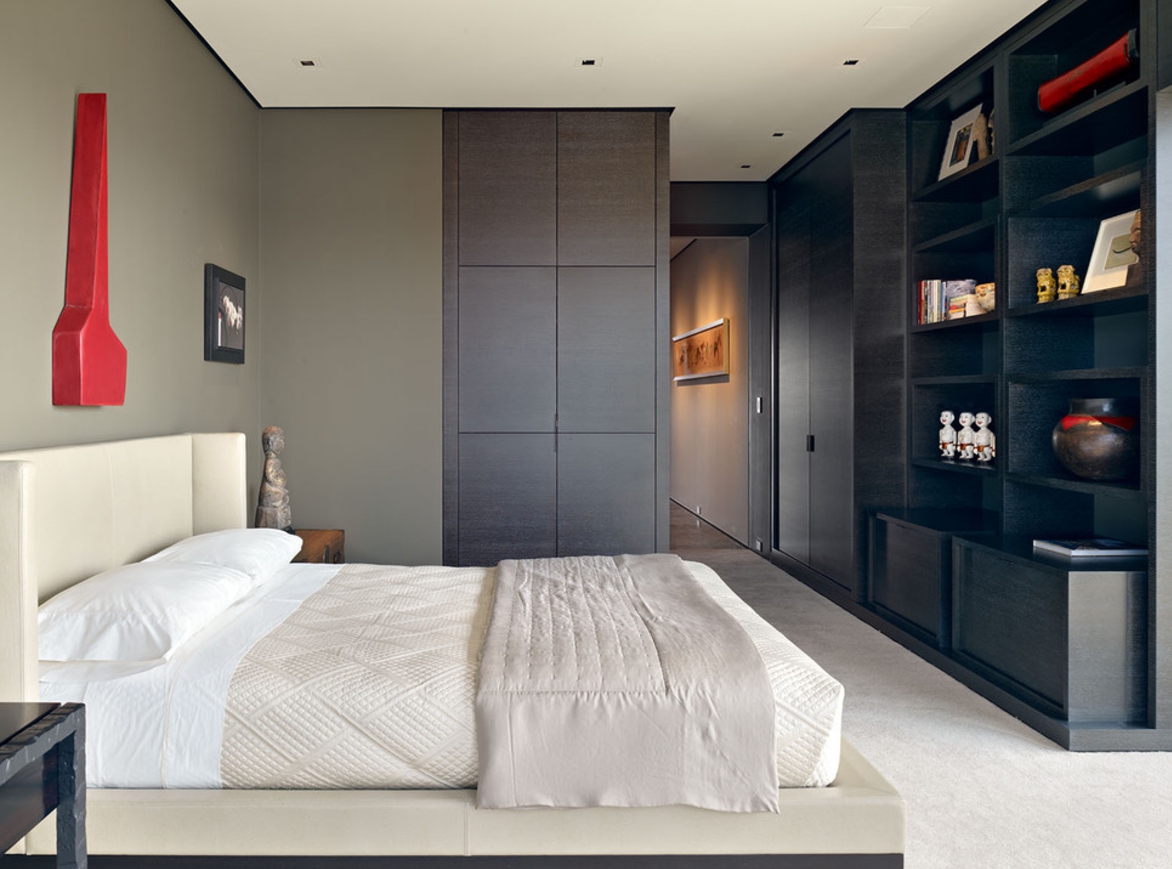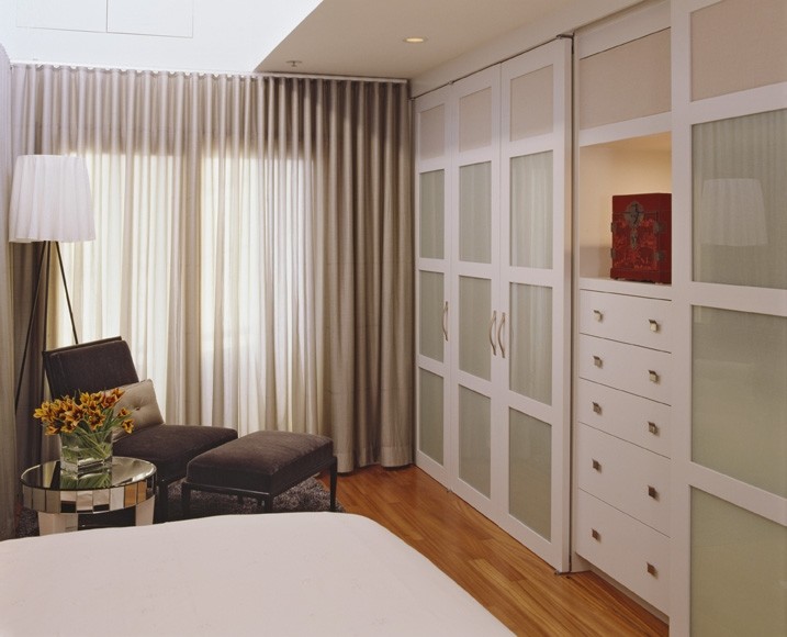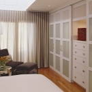 Im Schlafzimmer können Sie nicht nur eine lineare Garderobe, sondern auch mehr dimensionale Modelle wählen. Stellen Sie sicher, dass im Schrank nicht nur Kleider aufbewahrt werden, sondern auch Regale für Decken, Wäsche und Haushaltsgegenstände.