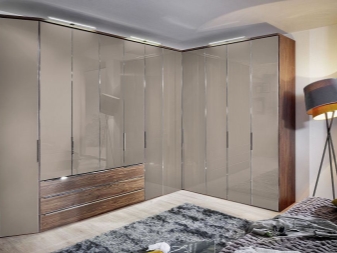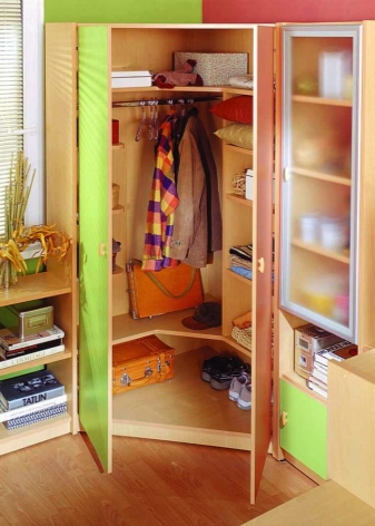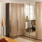 Solche Modelle sind in großen Räumen installiert. Der Eckschrank befindet sich entlang zweier benachbarter Wände, aber ein Teil ist normalerweise größer als der andere, so dass die Platzierung eines solchen Produkts sorgfältig geplant werden sollte.Kleine und schmale Eckschränke werden normalerweise in Büroräumen verwendet, da sie für die dauerhafte Aufbewahrung von Kleidung nicht sehr praktisch sind.