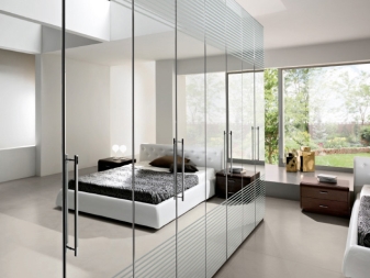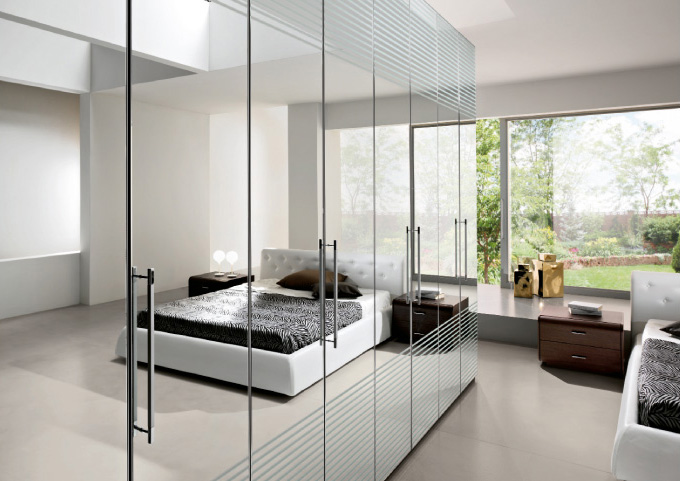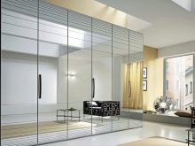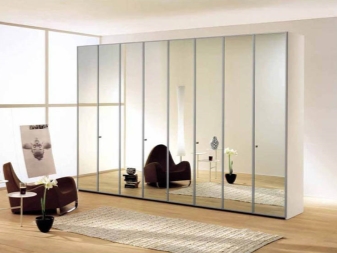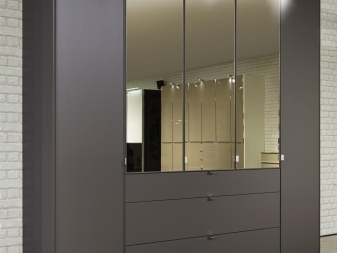 Für die Gestaltung der Schranktür mit einem Spiegel gibt es ausgezeichnete Designlösungen. Es kann die gesamte Oberfläche der Tür oder nur ihren oberen Teil einnehmen. Oft ist ein solider Spiegel in Fächer mit bewusst unterstrichenen Verbindungen unterteilt, um das Design origineller zu gestalten. Große Spiegel werden mit mattierten Mustern oder Buntglaszusammensetzungen geliefert.