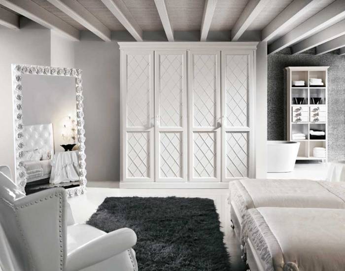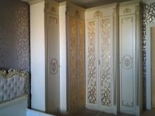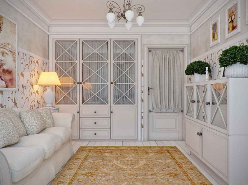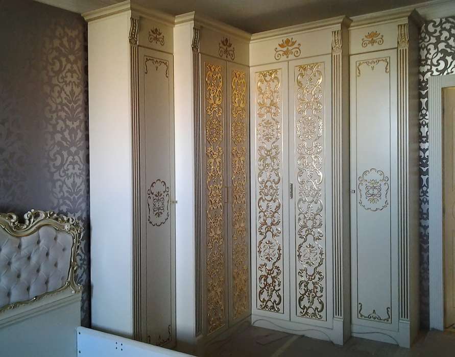 Damit die klassische Garderobe trotz der beeindruckenden Parameter leicht und luftig wirkt, kreieren die Designer geschnitzte Türen. Produkte mit Schnitzereien oder Abstraktionen von kunstvollen Linien und Monogrammen wirken elegant und sanft und verleihen dem Raum einen Hauch von Romantik.