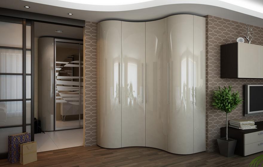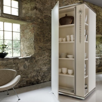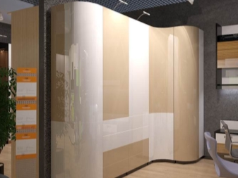 Radial klappbare Schränke wirken trotz der Größe kleiner als Standardmodelle. Solche Produkte haben eine konvex-konkave Form und glatte Linien. Sie haben keine scharfen Grenzen und Ecken. Sehr oft finden sich diese Modelle im eckigen Format.