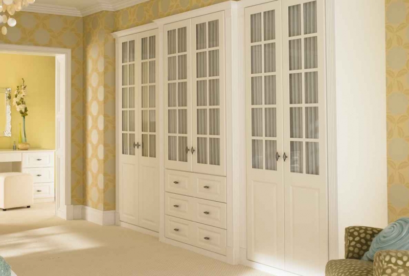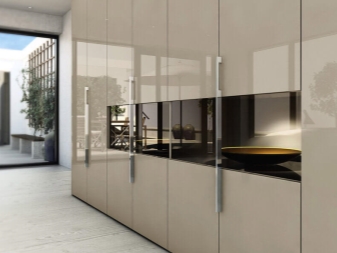 Glas wird oft in die Türen von schwingenden Schränken eingebaut. Es ist matt und transparent. Schränke mit Glaseinsätzen sind ideal für das Wohnzimmer, sie speichern Geschirr, Bücher oder andere Interieur-Attribute.