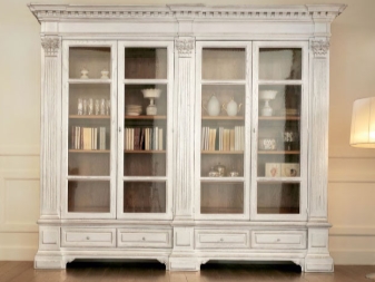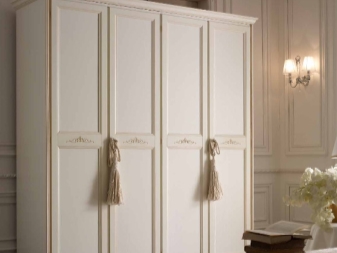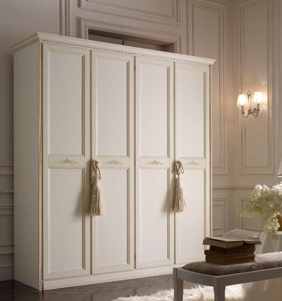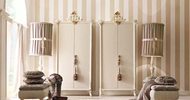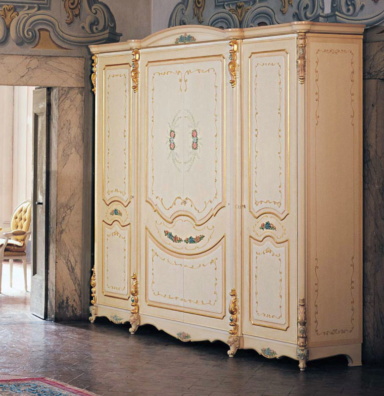 Produkte aus Naturholz eignen sich für den luxuriösen Barock, und sie sehen gut und solide aus. Entlang der Kanten des Flügels sind mit Holzschnitzerei und Seitenpilaster geliefert.Ein Merkmal der Klassiker ist die Lage der Schränke nicht auf dem Boden, sondern etwas höher, so dass die meisten Produkte mit Beinen ausgestattet sind. In den Farben sind helle Farbtöne bevorzugt, auf weißen oder cremefarbenen Türen werden oft Zeichnungen und Ornamente mit pastellfarbenen Akzenten angefertigt.