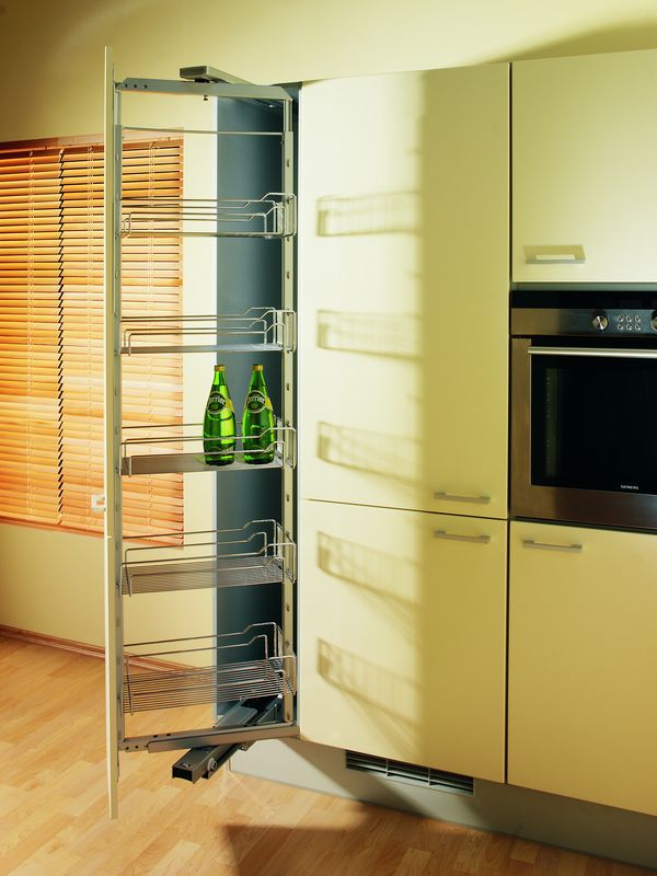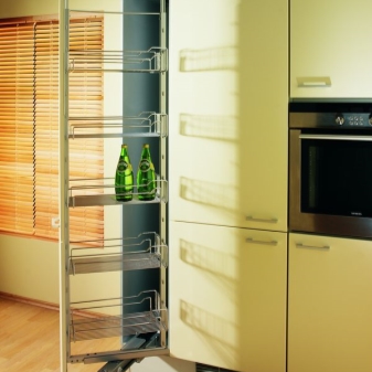 Hohe Schränke werden selten in der Küche installiert, aber das bedeutet nicht, dass Sie solche Möbel nicht für sich selbst wählen können. Der Fallfall bei einer bestimmten Planung wird organisch in eine Situation der Küche passen. Es braucht nicht viel Platz und ist ideal zum Aufbewahren von Küchenutensilien.