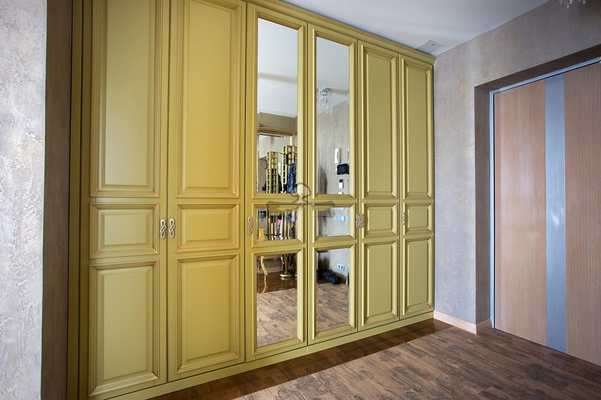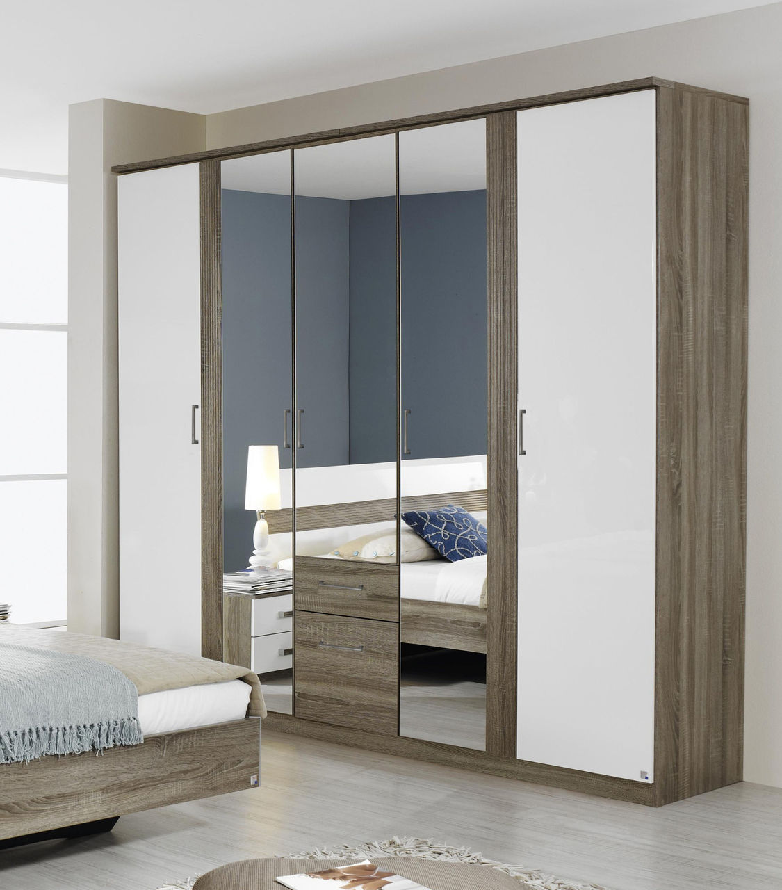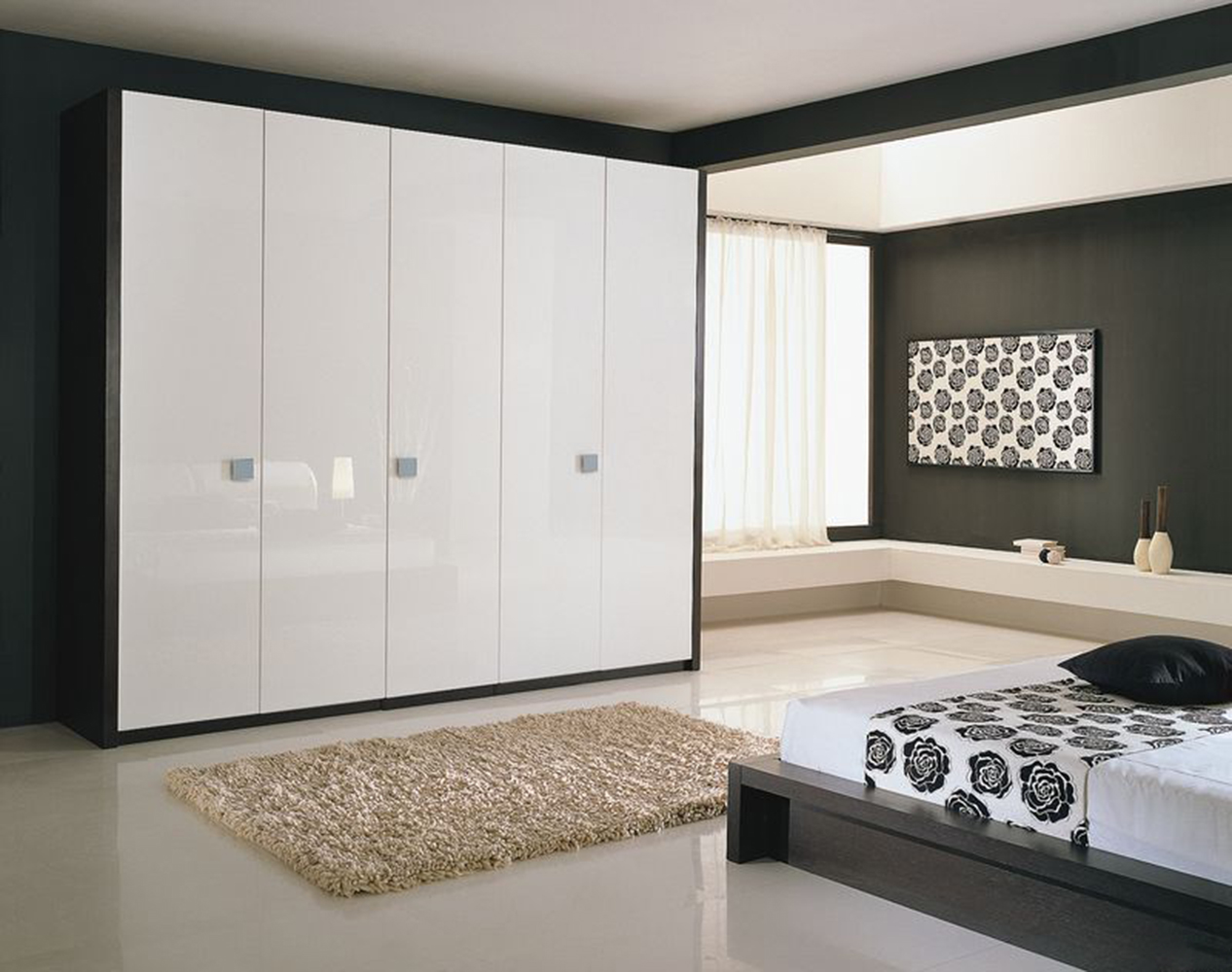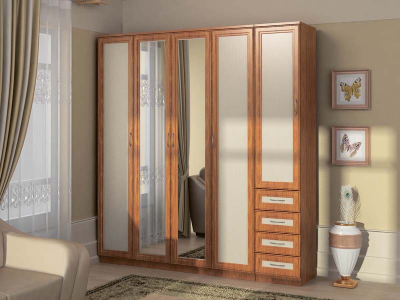 - Fünftüriger Kleiderschrank Es ist eine interessante Struktur, die entweder fünf oder vier Hauptabschnitte umfasst. Manchmal kombiniert ein Abschnitt beide Nischen mit einer Bar und Regalen für die Aufbewahrung kleiner Dinge.Ansonsten kann der fünftürige Schrank ein Fach wie eine Kommode aufweisen. Draußen sind die drei mittleren Abschnitte mit Spiegeltüren oder in einer anderen Farbgebung dekoriert.