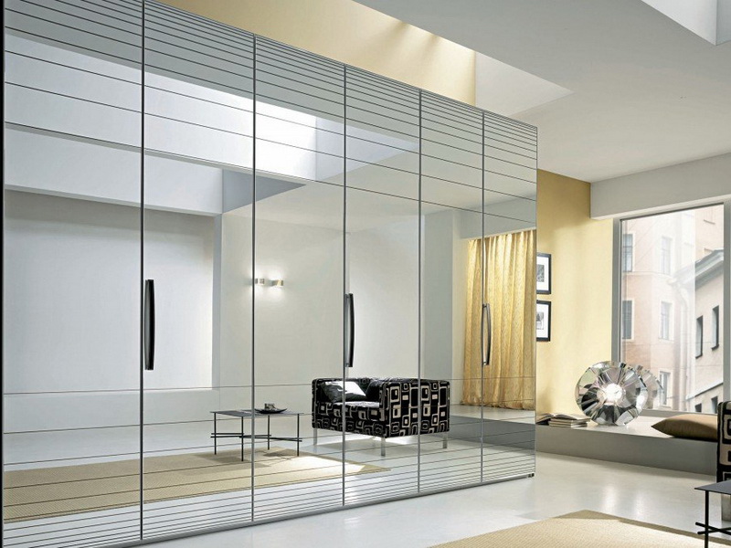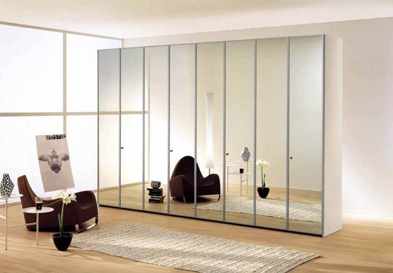 Um einen großen Chiffonier weniger auffällig zu machen und die Größe des Raumes optisch zu erhöhen, verwenden Sie einen kniffligen Trick. Die Türen des linearen Designs lassen sich komplett spiegeln. Durch die Verkleidung des Schrankes wirkt der Raum aufgeräumt und geräumig.