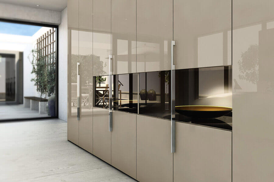 Neben der Auswahl der Farbfelder ist es wichtig, sie mit Dekormitteln zu gestalten. Schränke mit Flügeltüren haben meist eine geschlossene Fassade, so dass mehr Platz für die Dekoration von Produkten bleibt.