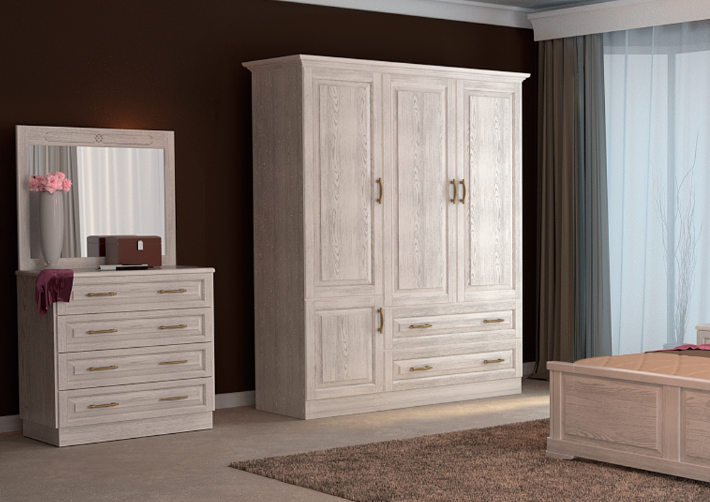- Naturholz Verwenden Sie für teure Modelle. Es sieht sehr solide und ästhetisch aus. Natürliche Holzfasern sind mit Schnitzereien oder dekorativen Elementen verziert.Die Produkte sind oft mit Lack beschichtet, was dem Baum zusätzlichen Widerstand gegen Beschädigung gibt und das Aussehen des Schrankes robuster macht.