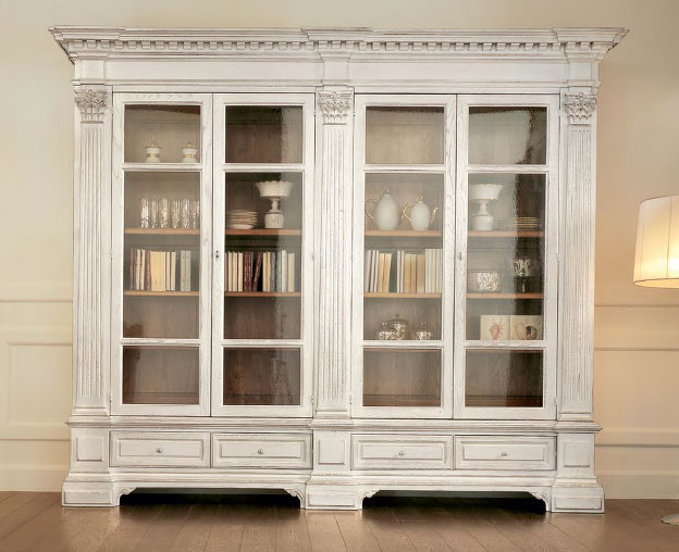 Schränke italienische Firma San Michele repräsentieren das gesamte Design, verkörpert im klassischen Stil. Sie werden oft mit in den Flügel eingelassenem Glas hergestellt. Primärfarben - Braun und Elfenbeinton.