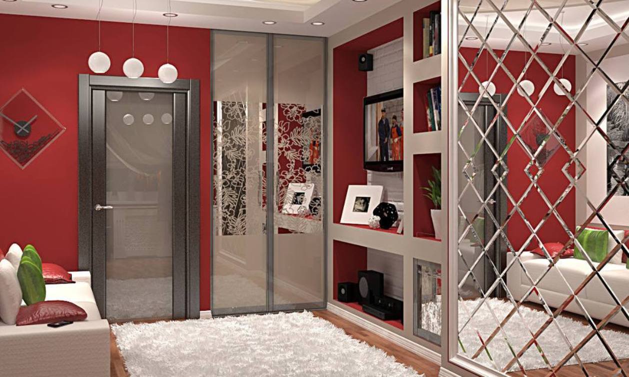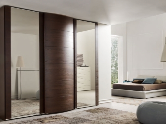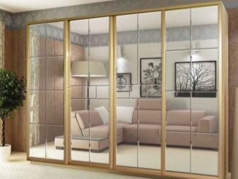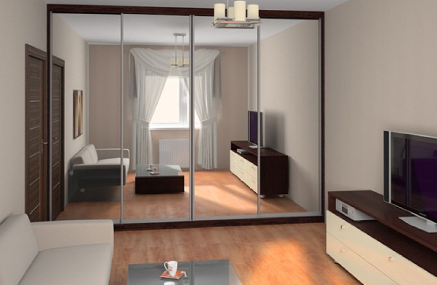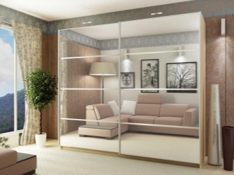Zum Beispiel, wenn ein großer Kleiderschrank in einer Wohnung installiert ist, wird seine Dimensionen wertvollen Raum verbergen. Aber auf Kosten von Spiegelläden werden die Größen der Raumfläche optisch zunehmen.