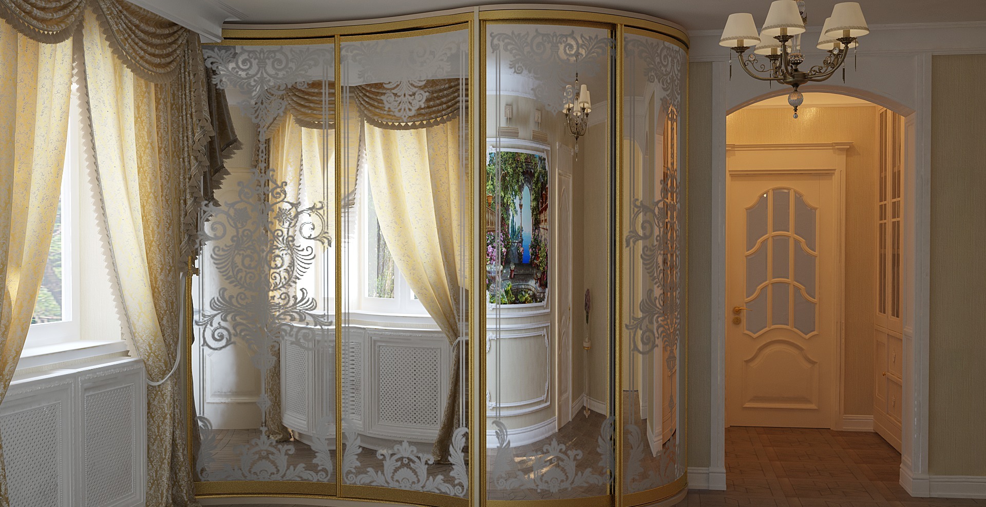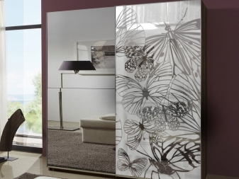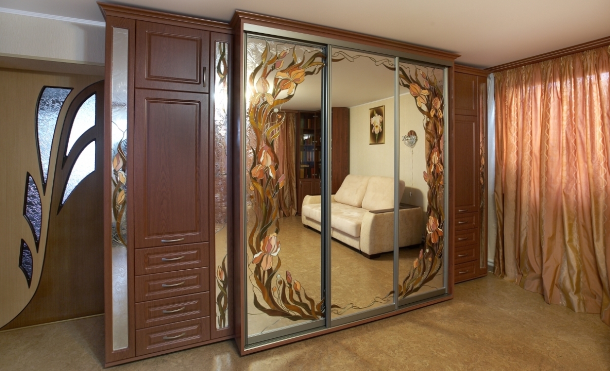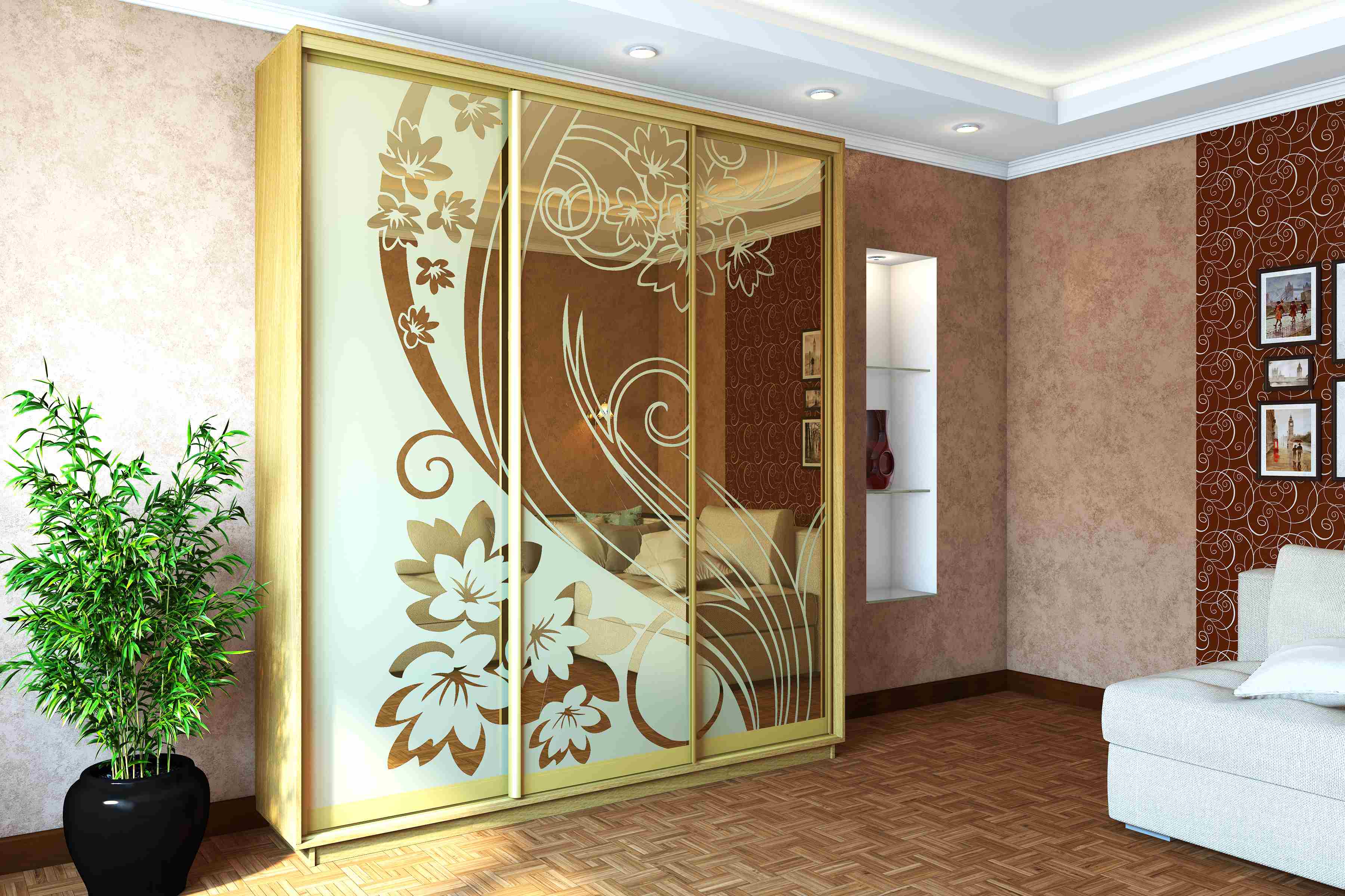 Schiebeschränke mit Spiegeltüren werden immer beliebter. sandgestrahlt. Es können geometrische Muster, florale Ornamente, verschiedene Wellenlinien sein. Das Schleifbild brennt nicht aus und wird nicht gelöscht, da es mit einer speziellen Maschine aufgetragen wird, die das Material unter hohem Druck mit Luft und Sand bearbeitet.