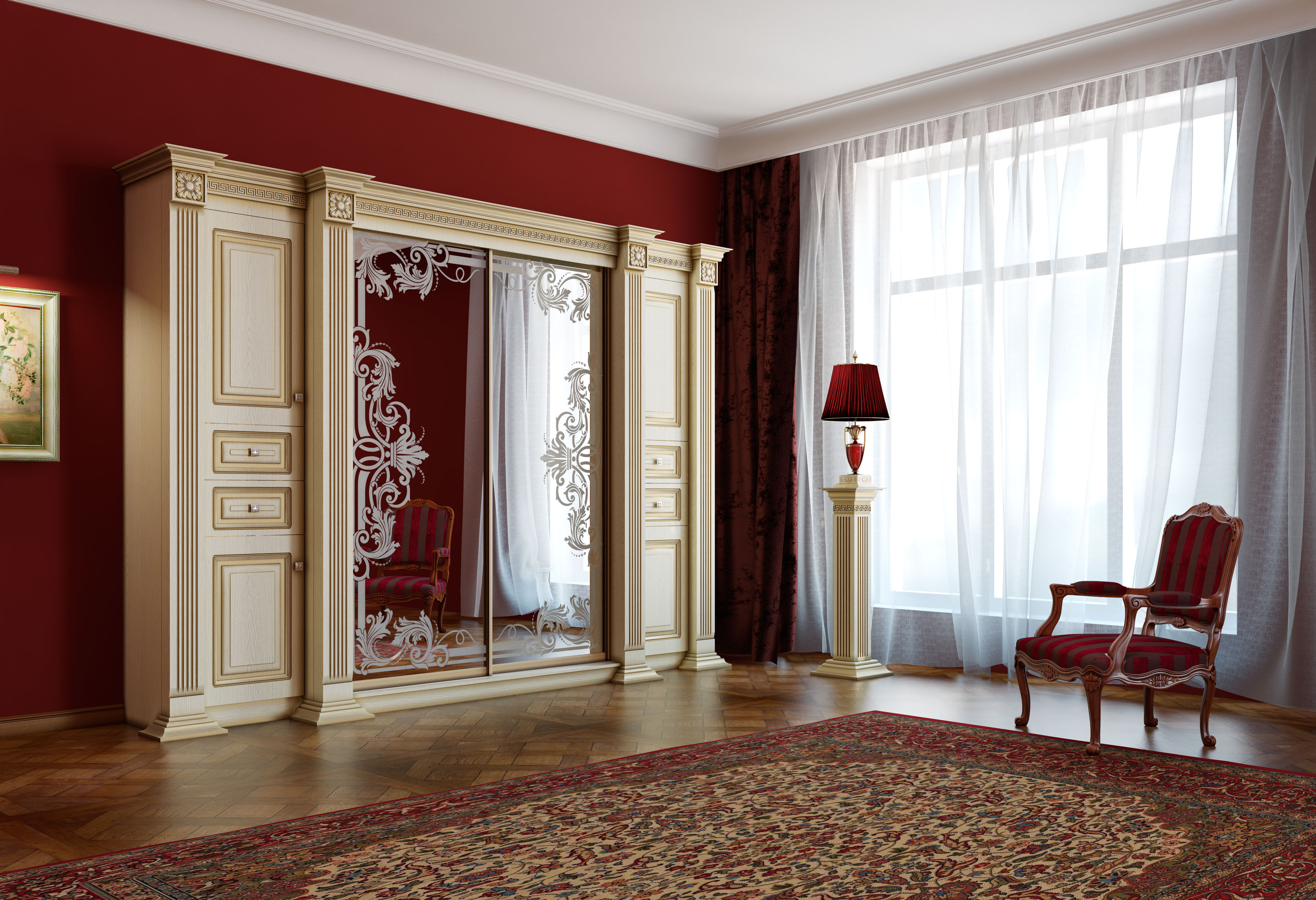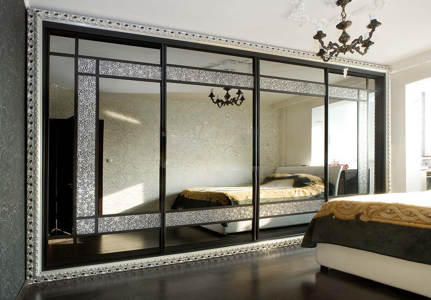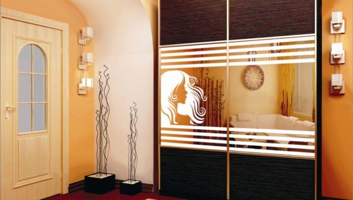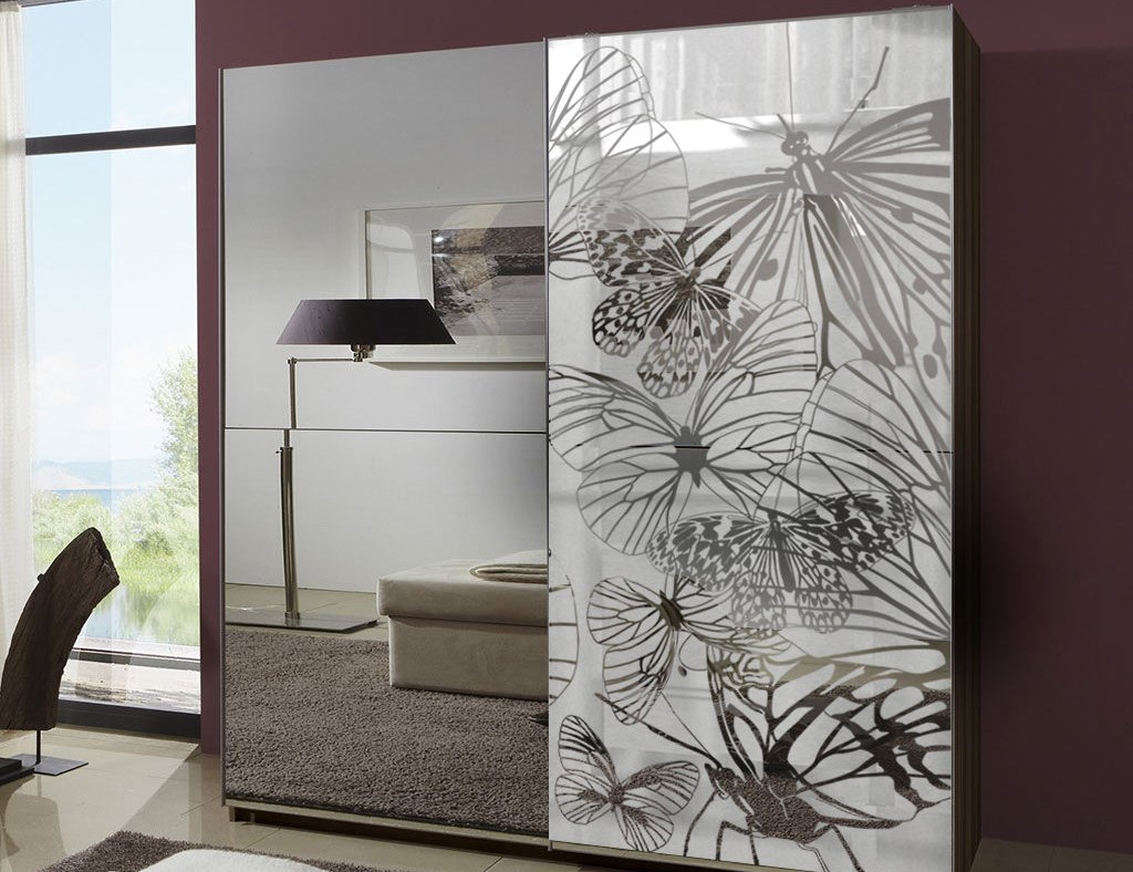 Schiebeschränke mit Spiegeltüren werden immer beliebter. sandgestrahlt. Es können geometrische Muster, florale Ornamente, verschiedene Wellenlinien sein. Das Schleifbild brennt nicht aus und wird nicht gelöscht, da es mit einer speziellen Maschine aufgetragen wird, die das Material unter hohem Druck mit Luft und Sand bearbeitet.