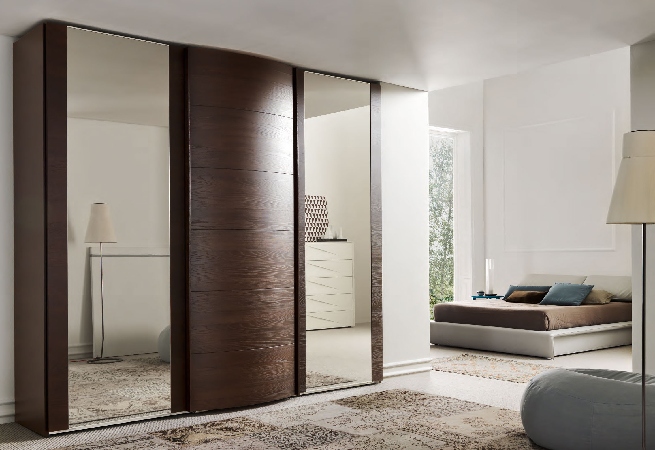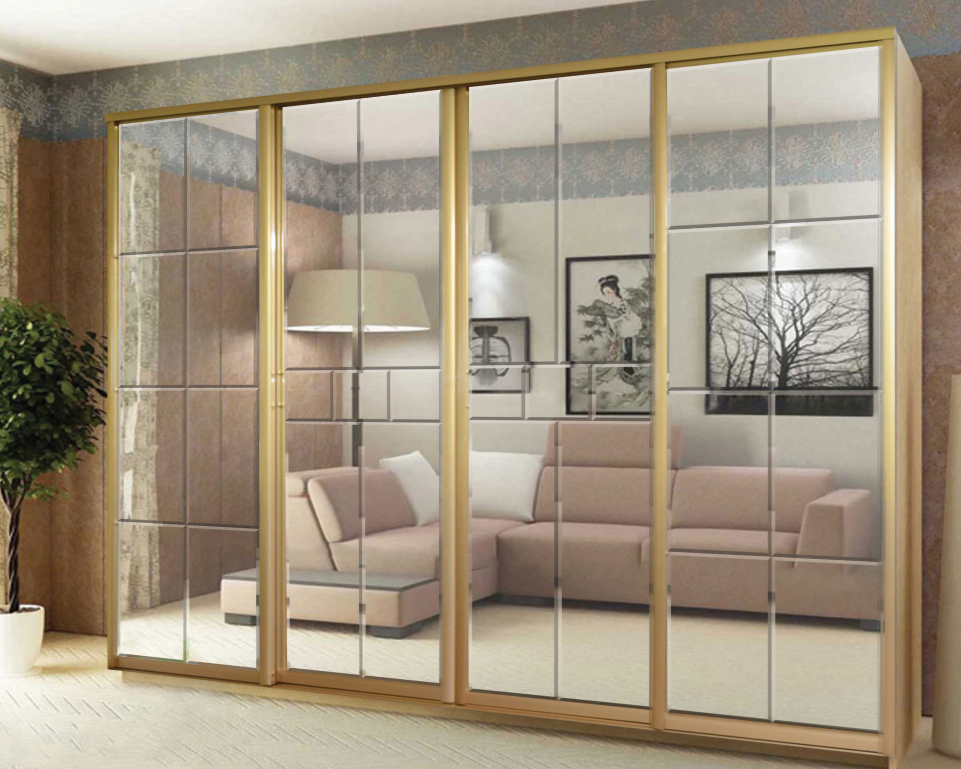 Große Schränke bestehen in der Regel aus mehreren Verbundprofilen, die durch Beschläge und zusätzliche Befestigungen miteinander verbunden sind. Ein Spiegel ist auf dem mittleren Abschnitt des Verbundmodells montiert.