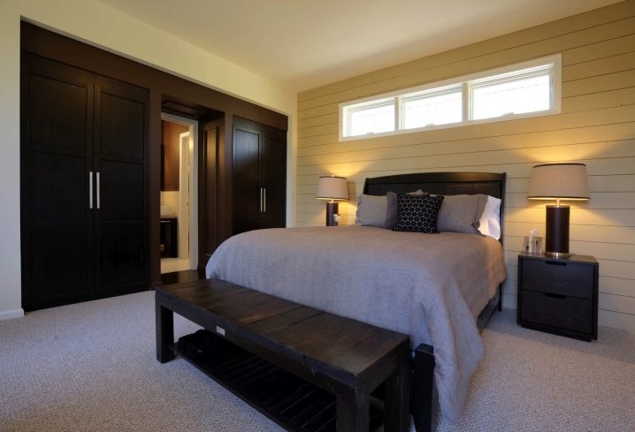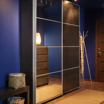 Neben der monochromen Leistung besteht die Möglichkeit, zweifarbige Versionen zu erstellen. Es kann ein strenges schwarz-braunes oder ein kontrastierendes Schwarz-Weiß-Duett sein, alles hängt von Ihrem persönlichen Geschmack ab. Glas- oder Spiegeltüren verleihen dem Design eine besondere Leichtigkeit. Vergessen Sie nicht die Möglichkeit von Spiegeln, die Illusion von zusätzlichem Raum zu schaffen.
