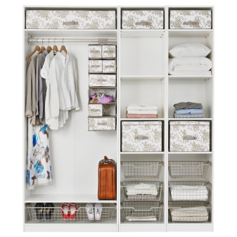 Ikea Pax Cabinet ist ein Design, das viele Elemente für die rationelle Platzierung von Kleidung, Schuhen, Textilien, Wäsche, Accessoires enthält. Alle Blöcke können einfach miteinander kombiniert und getauscht werden. Sie können Elemente in beliebiger Reihenfolge platzieren und an Ihre Bedürfnisse anpassen.