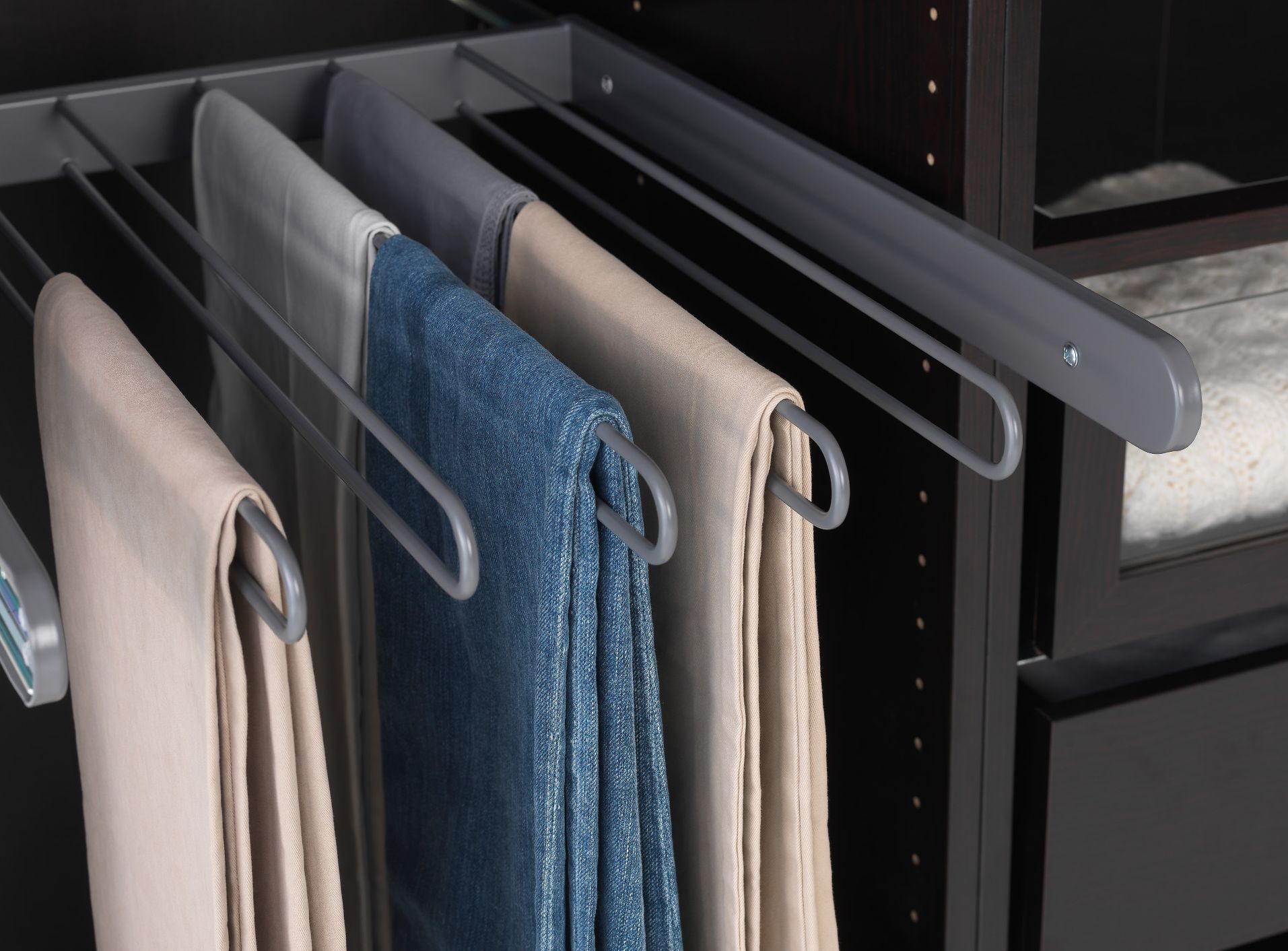 Ausziehbares Regal für Hosen - eine gute Lösung zum Sortieren von klassischen Hosen und Jeans. Auf dem obersten Regal (Mezzanine) können Sie Decken, Decken und Reisetaschen verstauen. An der Unterseite des Produkts können Sie ein Regal für Schuhe organisieren.