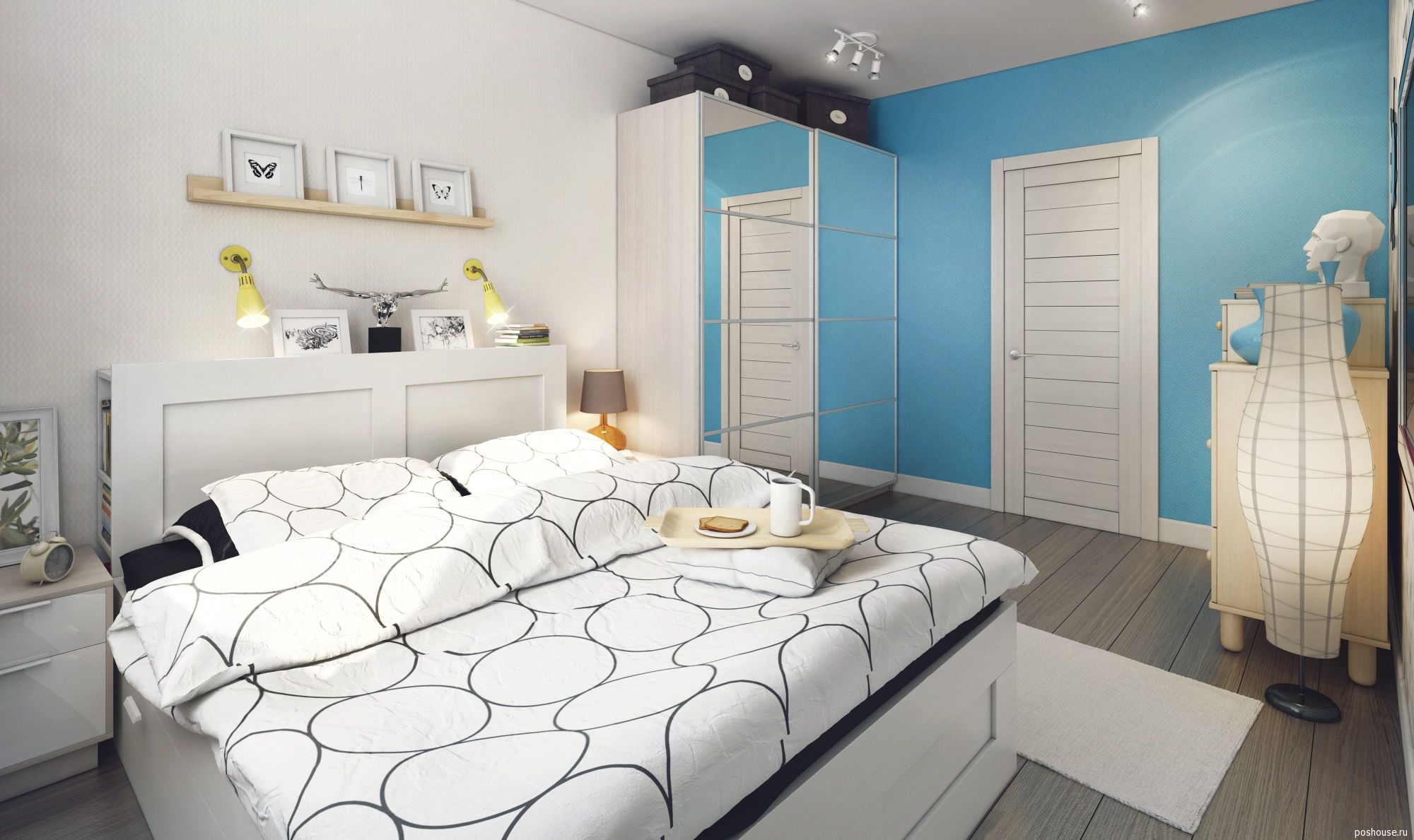 Ein kleiner Schrank mit einer "staubigen" blauen Tönung ist ein großer heller Akzent für ein weiß dekoriertes Zimmer. Klappstuhl, in Harmonie mit der Farbe der Möbel, hilft, ein komplettes Interieur in einem modernen Stil zu schaffen.
