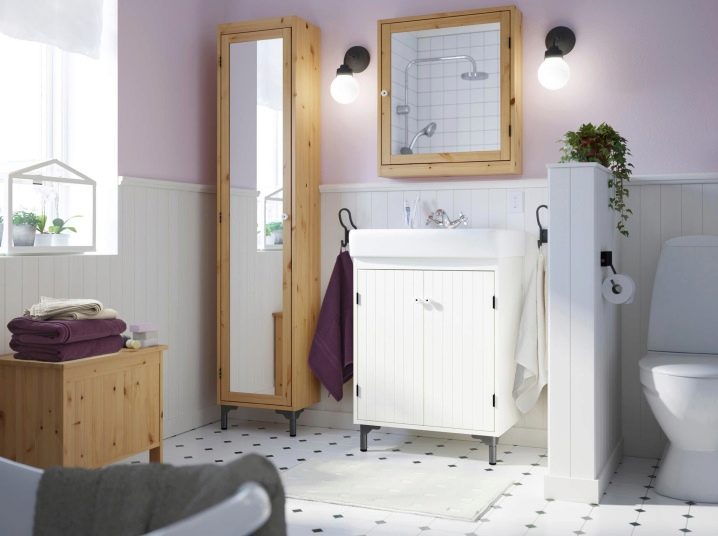 Wenn Größen Badezimmer erlauben Sie, können Sie ein kleines Schließfach in diesem Raum setzen. Sie können Handtücher, Bademäntel, Haushaltschemikalien darin speichern. Sie können den Kleiderschrank auch als Raumteiler in zwei Zonen verwenden. Diese Lösung ist relevant für Studio-Apartments.