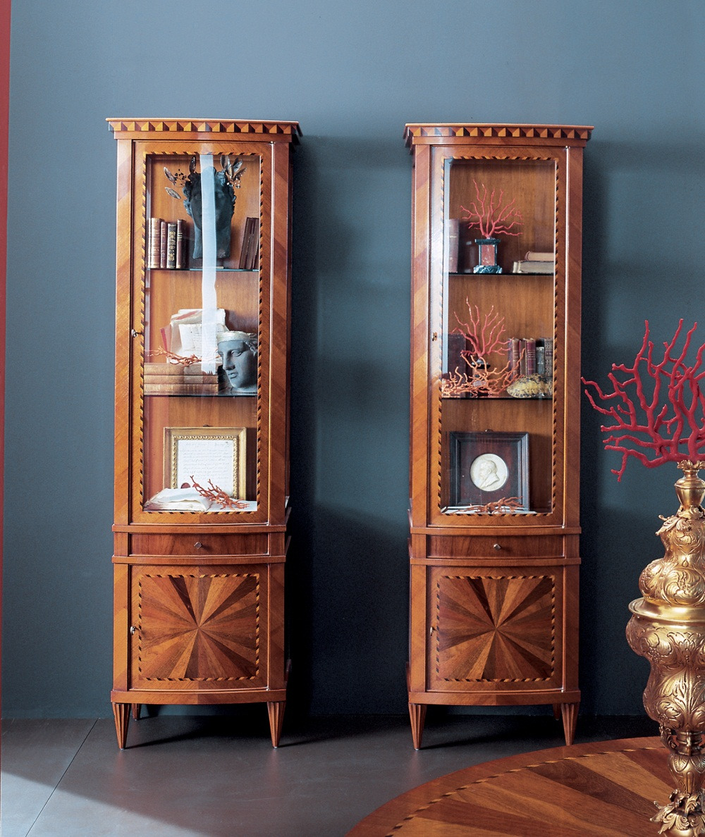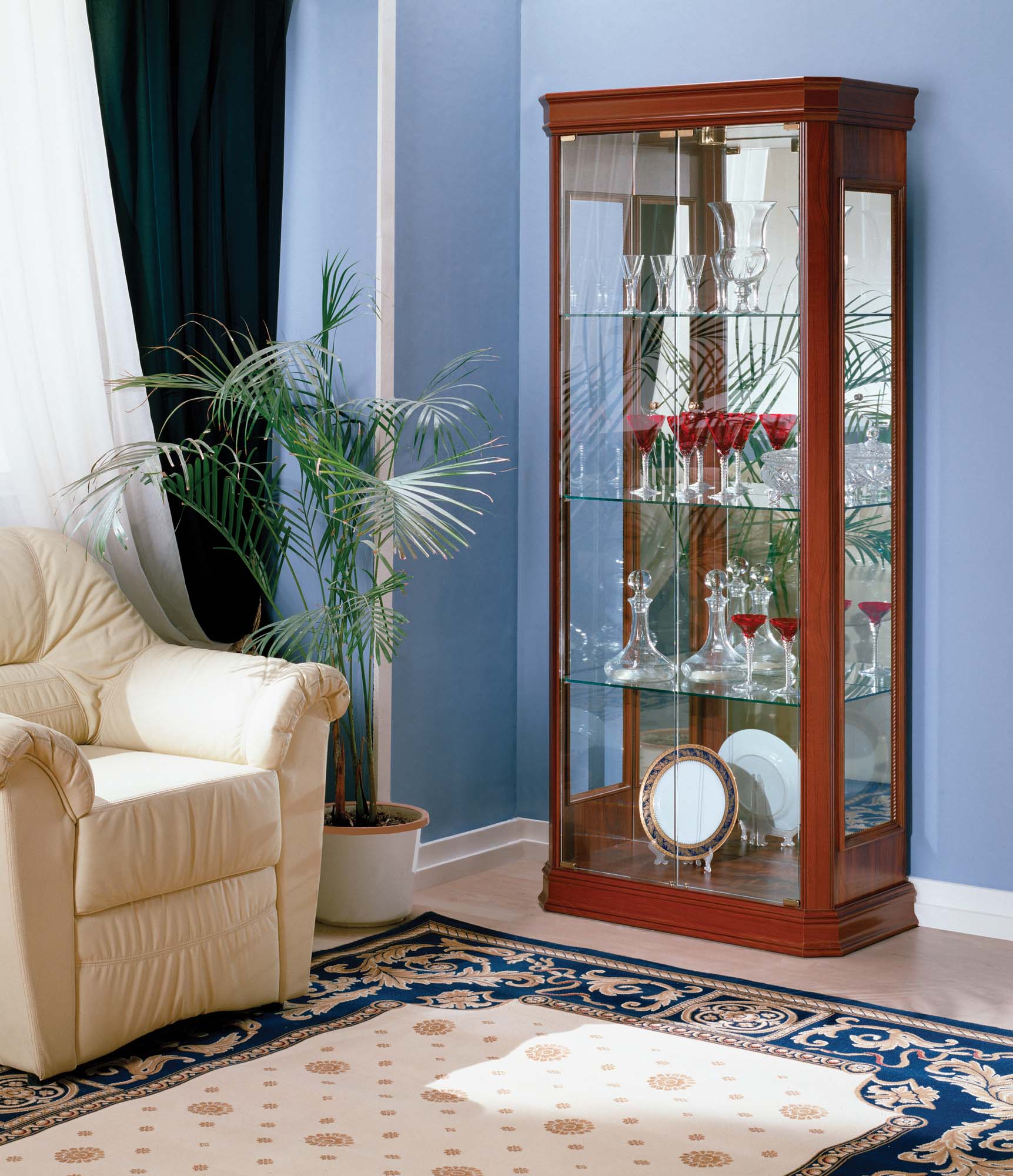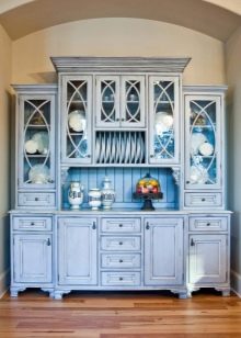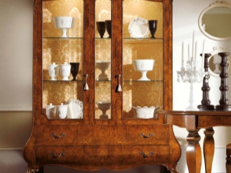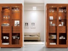 - Vitrinenschränke. Möbel sind ein vollständig oder teilweise transparentes Design. In einigen Fällen wird der Schrank durch kleine Schubladen ergänzt. Solche Modelle können in Boden-, Hänge- und Einbautypen unterteilt werden.